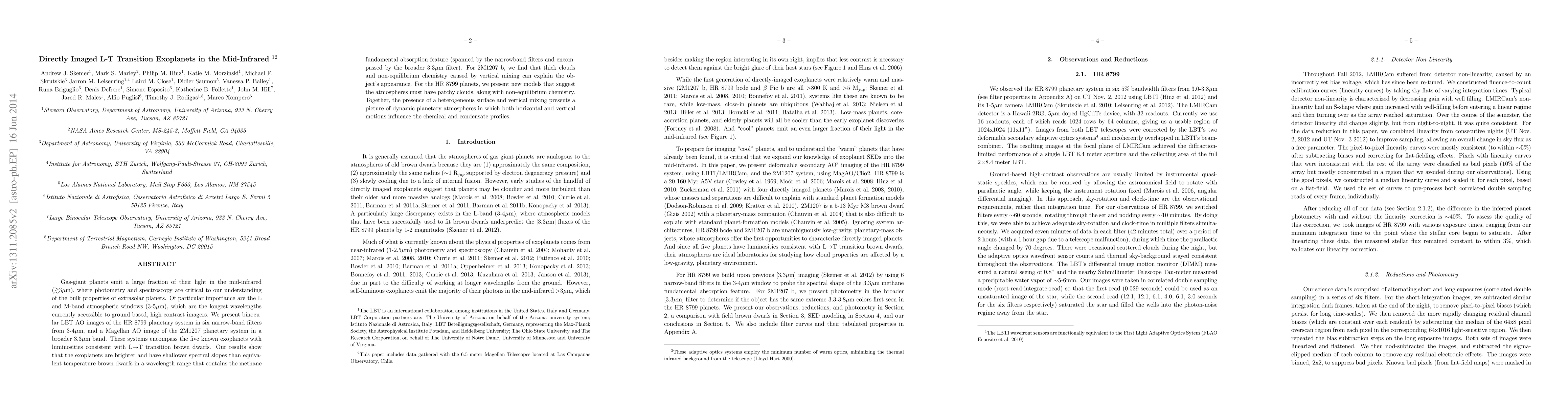 Gas-giant planets emit a large fraction of their light in the mid-infrared ($\gtrsim$3$\mu$m), where photometry and spectroscopy are critical to our understanding of the bulk properties of extrasolar planets. Of particular importance are the L and M-band atmospheric windows (3-5$\mu$m), which are the longest wavelengths currently accessible to ground-based, high-contrast imagers. We present binocular LBT AO images of the HR 8799 planetary system in six narrow-band filters from 3-4$\mu$m, and a Magellan AO image of the 2M1207 planetary system in a broader 3.3$\mu$m band. These systems encompass the five known exoplanets with luminosities consistent with L$\rightarrow$T transition brown dwarfs. Our results show that the exoplanets are brighter and have shallower spectral slopes than equivalent temperature brown dwarfs in a wavelength range that contains the methane fundamental absorption feature (spanned by the narrowband filters and encompassed by the broader 3.3$\mu$m filter). For 2M1207 b, we find that thick clouds and non-equilibrium chemistry caused by vertical mixing can explain the object's appearance. For the HR 8799 planets, we present new models that suggest the atmospheres must have patchy clouds, along with non-equilibrium chemistry. Together, the presence of a heterogeneous surface and vertical mixing presents a picture of dynamic planetary atmospheres in which both horizontal and vertical motions influence the chemical and condensate profiles.