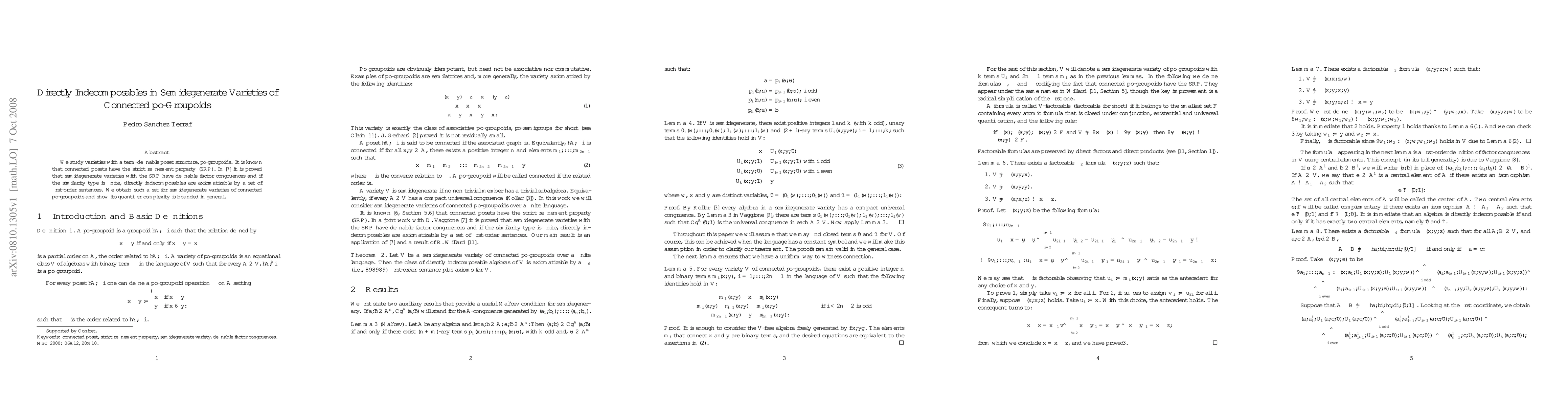 We study varieties with a term-definable poset structure, "po-groupoids". It is known that connected posets have the "strict refinement property" (SRP). In [arXiv:0808.1860v1 [math.LO]] it is proved that semidegenerate varieties with the SRP have definable factor congruences and if the similarity type is finite, directly indecomposables are axiomatizable by a set of first-order sentences. We obtain such a set for semidegenerate varieties of connected po-groupoids and show its quantifier complexity is bounded in general.