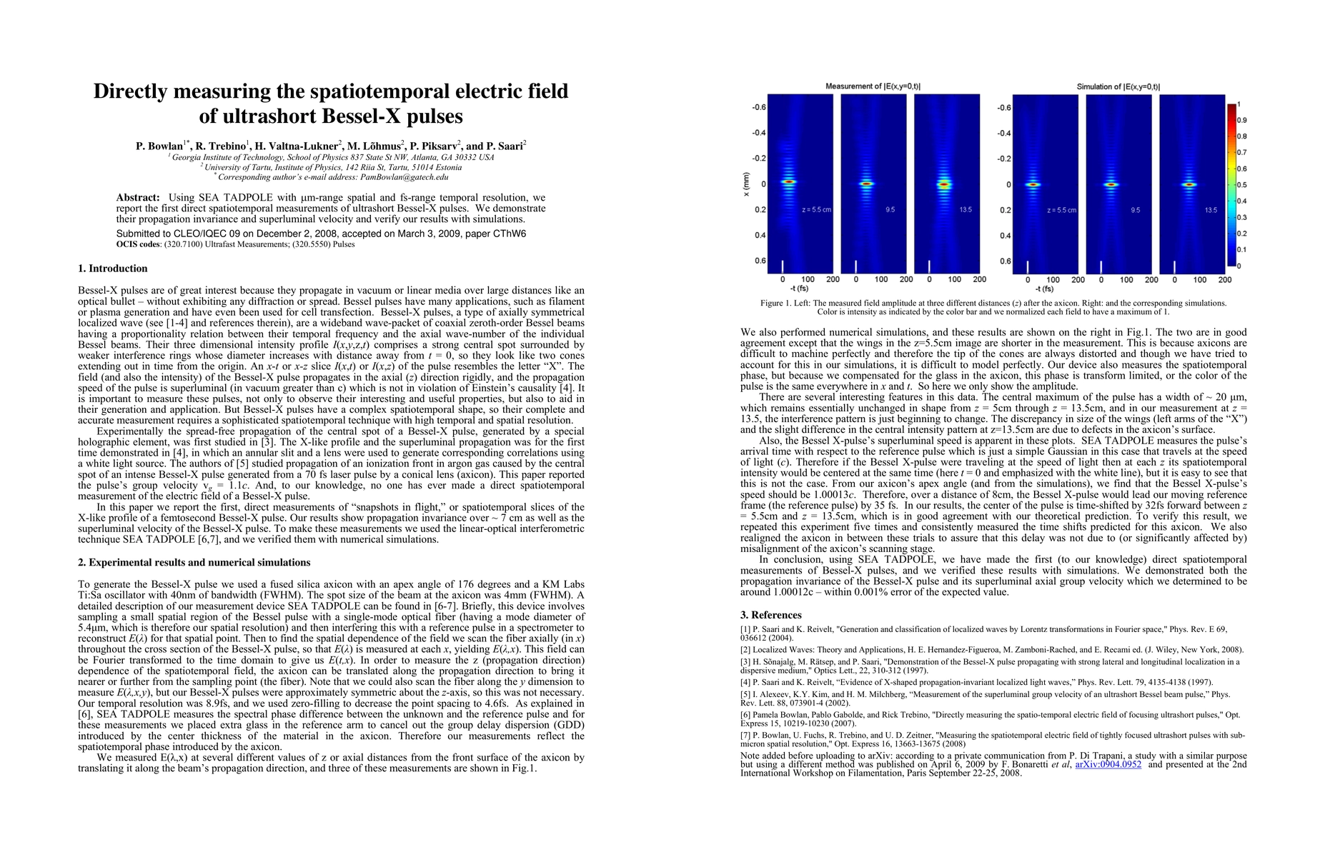 Summary: This study employs SEA TADPOLE to directly measure the spatiotemporal electric field of ultrashort Bessel-X pulses, revealing their propagation invariance and superluminal velocity, validated by simulations.