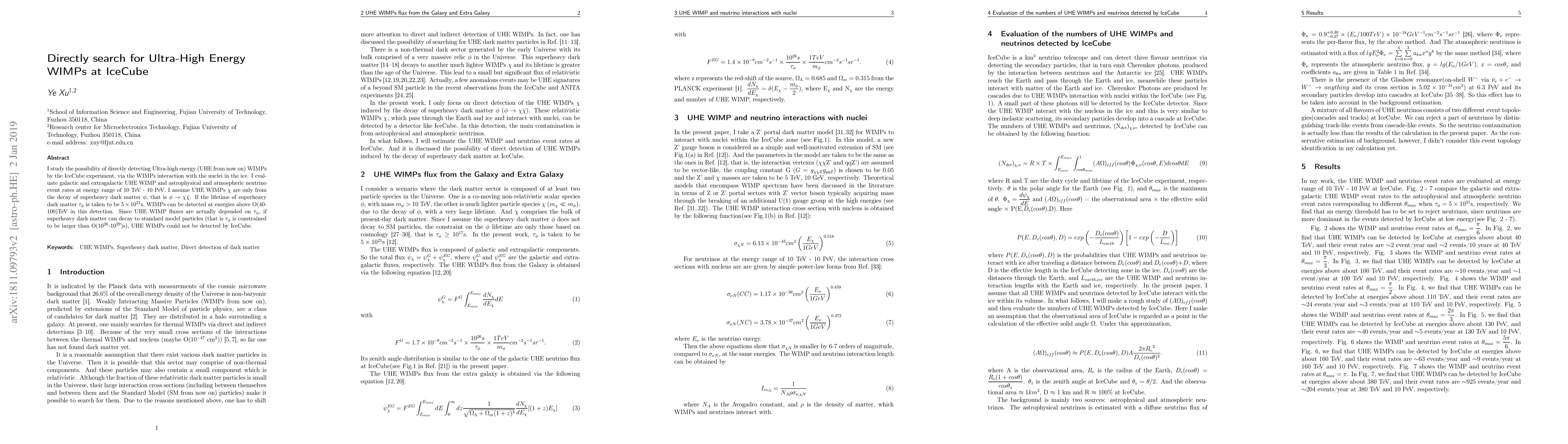 This research explores the potential of the IceCube experiment to directly detect Ultra-high energy (UHE) WIMPs through their interactions with ice nuclei. The study evaluates the event rates of UHE WIMPs and compares them to astrophysical and atmospheric neutrinos in the energy range of 10 TeV to 10 PeV, concluding that UHE WIMPs from decaying superheavy dark matter may be detectable above 40-100 TeV, but detection is contingent on the lifetime of the superheavy dark matter.