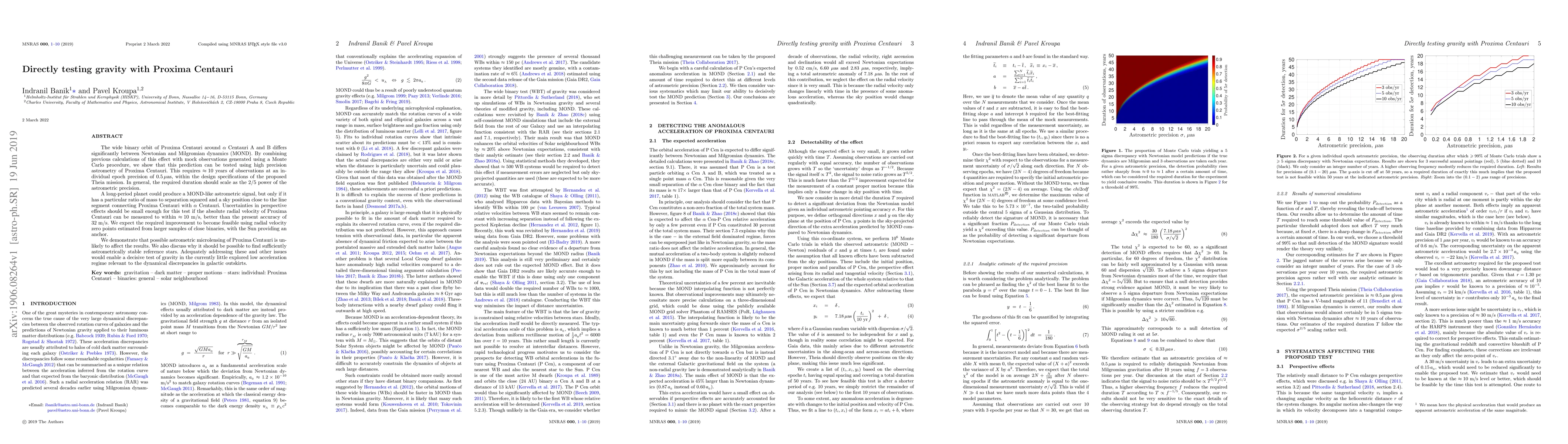 This paper proposes a method to test gravity using high-precision astrometry of Proxima Centauri, comparing predictions from Newtonian and Milgromian dynamics. It suggests that approximately 10 years of observations with 0.5 μas precision, achievable by the Theia mission, could provide a decisive test in the low acceleration regime.