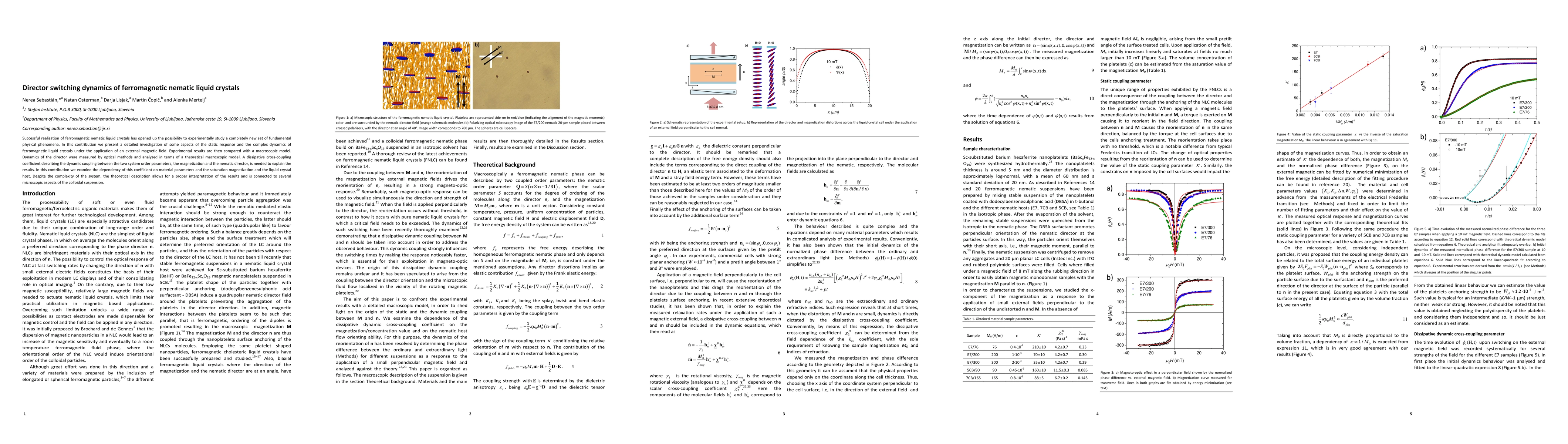 Successful realization of ferromagnetic nematic liquid crystals has opened up the possibility to experimentally study a completely new set of fundamental physical phenomena. In this contribution we present a detailed investigation of some aspects of the static response and the complex dynamics of ferromagnetic liquid crystals under the application of an external magnetic field. Experimental results are then compared with a macroscopic model. Dynamics of the director were measured by optical methods and analyzed in terms of a theoretical macroscopic model. A dissipative cross-coupling coefficient describing the dynamic coupling between the two system order parameters, the magnetization and the nematic director, is needed to explain the results. In this contribution we examine the dependency of this coefficient on material parameters and the saturation magnetization and the liquid crystal host. Despite the complexity of the system, the theoretical description allows for a proper interpretation of the results and is connected to several microscopic aspects of the colloidal suspension.