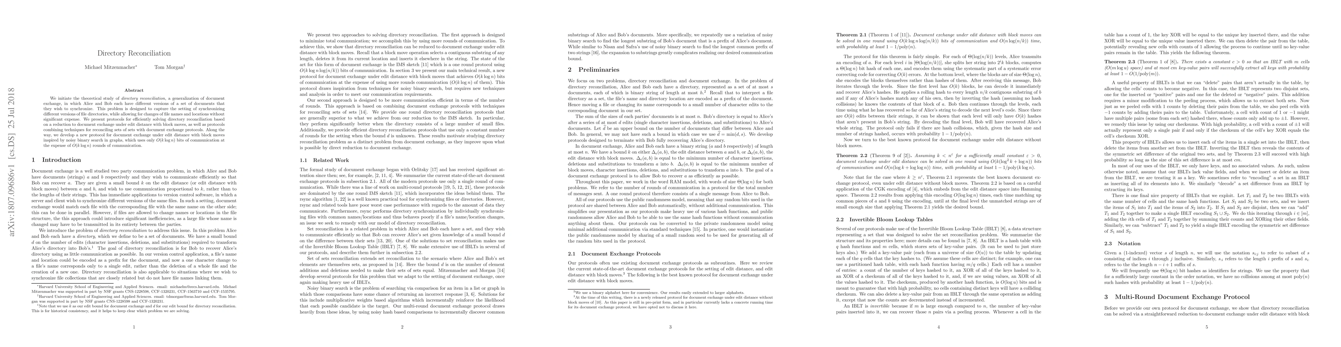 We initiate the theoretical study of directory reconciliation, a generalization of document exchange, in which Alice and Bob each have different versions of a set of documents that they wish to synchronize. This problem is designed to capture the setting of synchronizing different versions of file directories, while allowing for changes of file names and locations without significant expense. We present protocols for efficiently solving directory reconciliation based on a reduction to document exchange under edit distance with block moves, as well as protocols combining techniques for reconciling sets of sets with document exchange protocols. Along the way, we develop a new protocol for document exchange under edit distance with block moves inspired by noisy binary search in graphs, which uses only $O(k \log n)$ bits of communication at the expense of $O(k \log n)$ rounds of communication.
