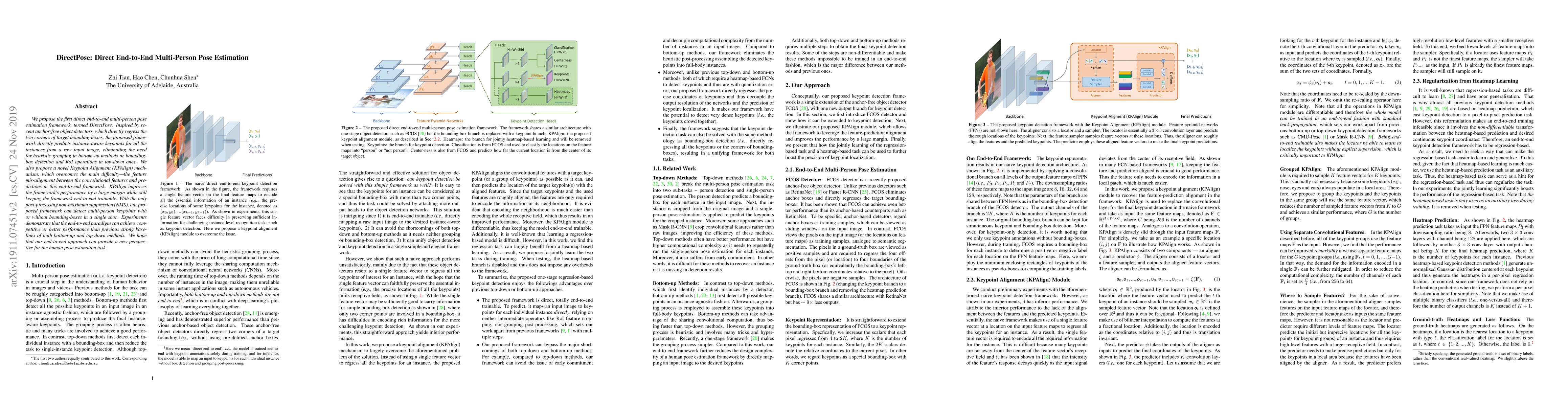 DirectPose introduces an end-to-end framework for multi-person pose estimation that directly predicts instance-aware keypoints from raw images, eliminating the need for bounding boxes or heuristic grouping. The Keypoint Alignment mechanism enhances performance, achieving competitive results compared to traditional methods.