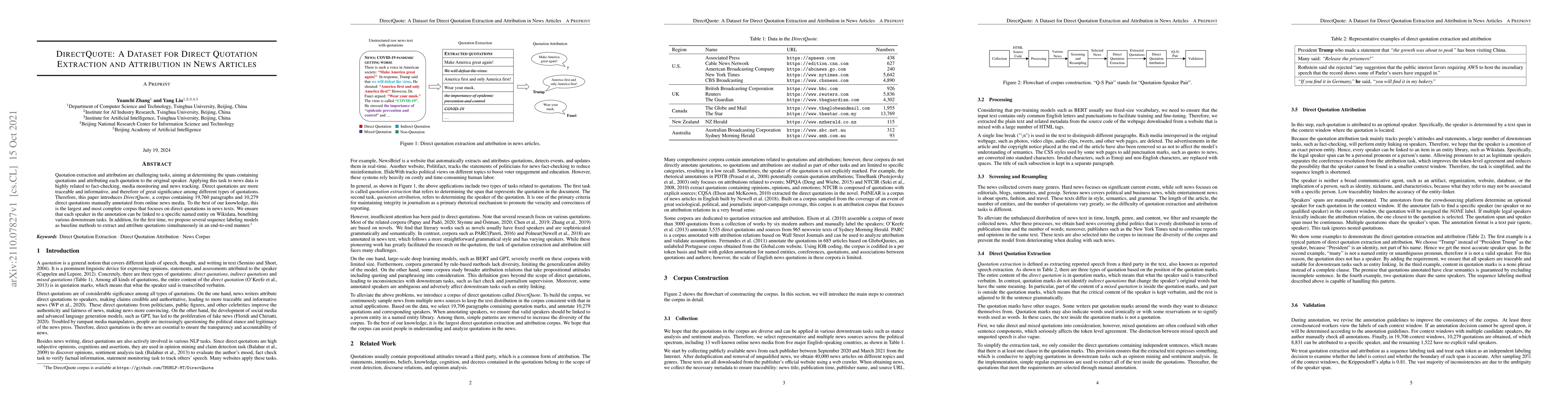 This paper introduces DirectQuote, a large annotated dataset of 19,760 paragraphs and 10,279 direct quotations from news articles, aimed at improving quotation extraction and attribution. It also proposes sequence labeling models for end-to-end quotation extraction and speaker attribution, benefiting fact-checking and media monitoring.