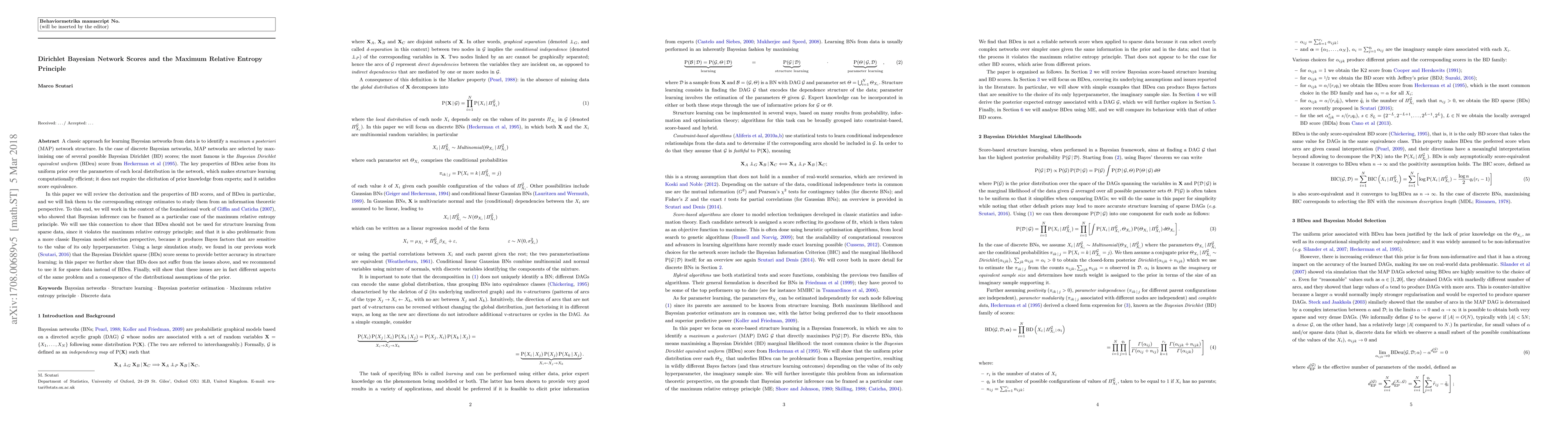 This paper reviews Bayesian Dirichlet (BD) scores, particularly the BDeu score, and links them to the maximum relative entropy principle. It argues that BDeu is unsuitable for sparse data due to its violation of this principle and sensitivity to hyperparameters, recommending BDs as a better alternative for such data.