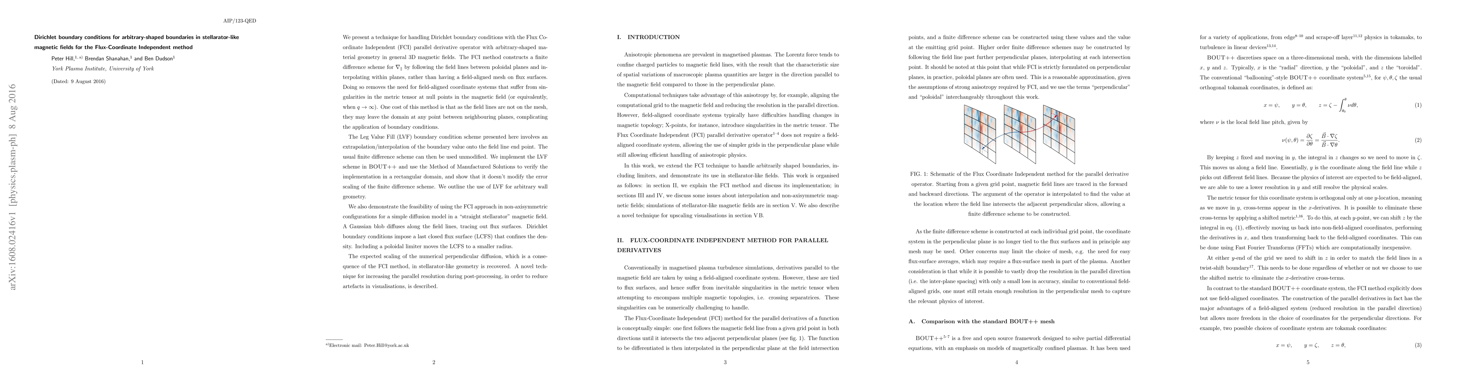 We present a technique for handling Dirichlet boundary conditions with the Flux Coordinate Independent (FCI) parallel derivative operator with arbitrary-shaped material geometry in general 3D magnetic fields. The FCI method constructs a finite difference scheme for $\nabla_\Vert$ by following field lines between planes and interpolating within planes. Doing so removes the need for field-aligned coordinate systems that suffer from singularities in the metric tensor at null points in the magnetic field (or equivalently, when $q \to \infty$). One cost of this method is that as the field lines are not on the mesh, they may leave the domain at any point between neighbouring planes, complicating the application of boundary conditions. The Leg Value Fill (LVF) boundary condition scheme presented here involves an extrapolation/interpolation of the boundary value onto the field line end point. The usual finite difference scheme can then be used unmodified. We implement the LVF scheme in BOUT++ and use the Method of Manufactured Solutions to verify the implementation in a rectangular domain, and show that the error scaling of the finite difference scheme isn't modified. The use of LVF for arbitrary wall geometry is outlined. We also demonstrate the feasibility of using the FCI approach in non-axisymmetric configurations for a simple diffusion model in a "straight stellarator" magnetic field. A Gaussian blob diffuses along the field lines, tracing out flux surfaces. Dirichlet boundary conditions impose a last closed flux surface (LCFS) that confines the density. Including a poloidal limiter moves the LCFS to a smaller radius. The expected scaling of the numerical perpendicular diffusion, which is a consequence of the FCI method, in stellarator-like geometry is recovered. A novel technique for increasing the parallel resolution during post-processing is also described.