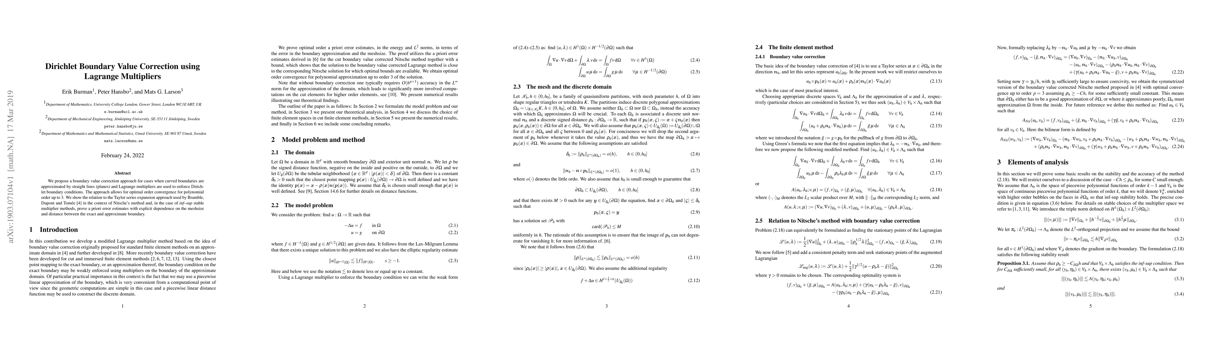 This paper introduces a boundary value correction method using Lagrange multipliers for approximating curved boundaries with straight lines, achieving optimal convergence for polynomial orders up to 3. It relates this approach to Bramble, Dupont, and Tomé's Taylor series expansion and provides a priori error estimates dependent on mesh size and boundary approximation accuracy.