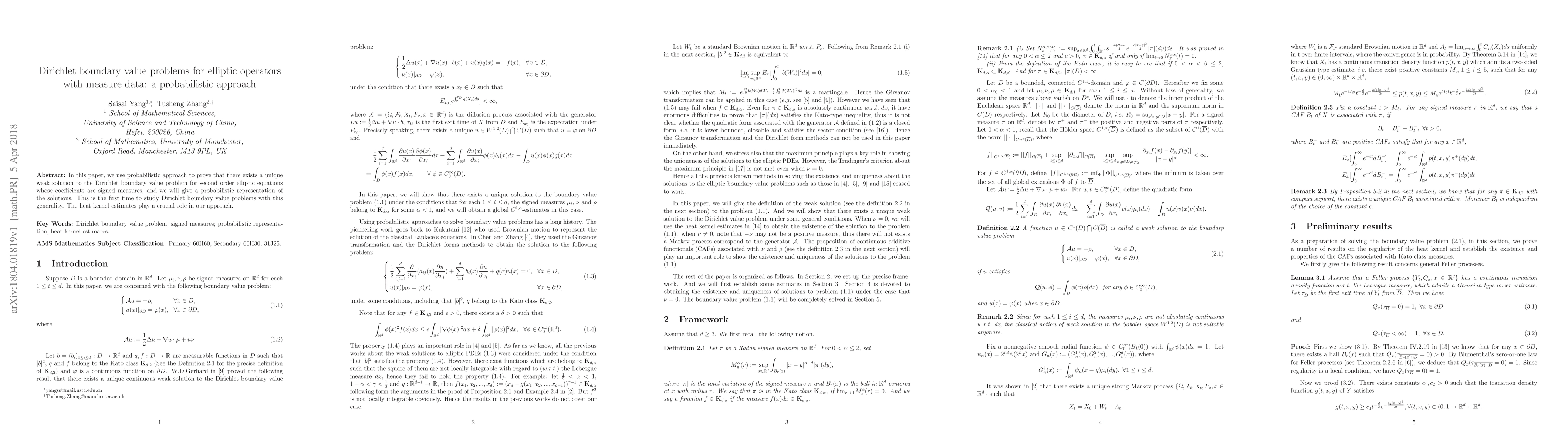 In this paper, we use probabilistic approach to prove that there exists a unique weak solution to the Dirichlet boundary value problem for second order elliptic equations whose coefficients are signed measures, and we will give a probabilistic representation of the solutions. This is the first time to study Dirichlet boundary value problems with this generality. The heat kernel estimates play a crucial role in our approach.