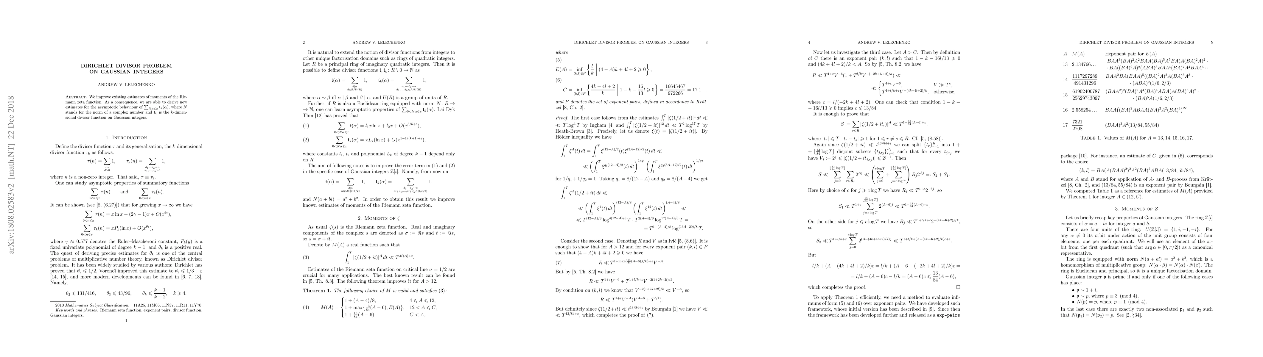 We improve existing estimates of moments of the Riemann zeta function. As a consequence, we are able to derive new estimates for the asymptotic behaviour of $\sum_{N \alpha \le x} \mathfrak{t}_k(\alpha)$, where $N$ stands for the norm of a complex number and $\mathfrak{t}_k$ is the $k$-dimensional divisor function on Gaussian integers.