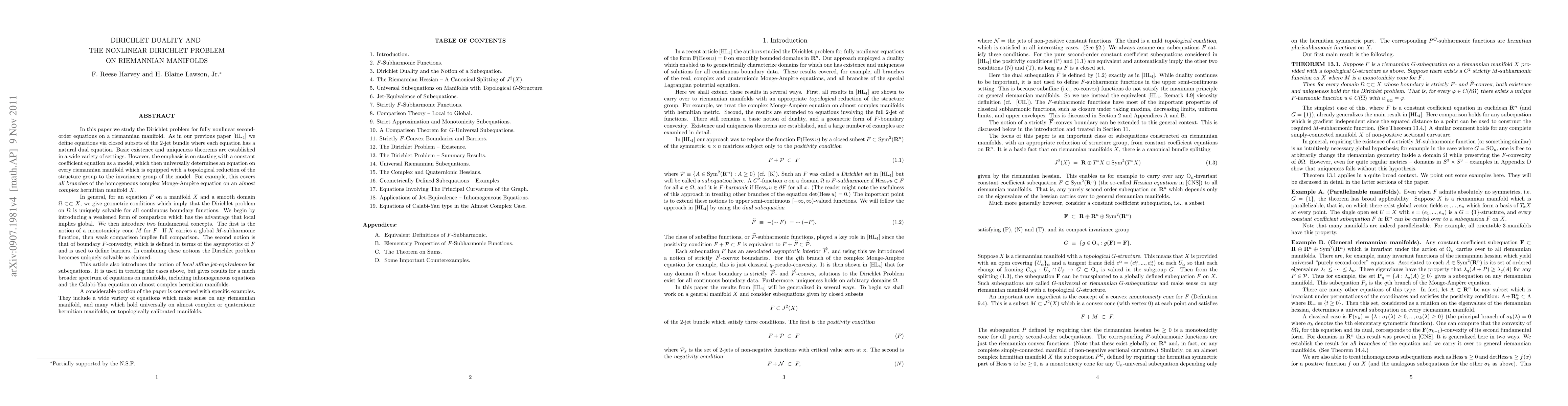 In this paper we study the Dirichlet problem for fully nonlinear second-order equations on a riemannian manifold. As in a previous paper we define equations via closed subsets of the 2-jet bundle. Basic existence and uniqueness theorems are established in a wide variety of settings. However, the emphasis is on starting with a constant coefficient equation as a model, which then universally determines an equation on every riemannian manifold which is equipped with a topological reduction of the structure group to the invariance group of the model. For example, this covers all branches of the homogeneous complex Monge-Ampere equation on an almost complex hermitian manifold X. In general, for an equation F on a manifold X and a smooth domain D in X, we give geometric conditions which imply that the Dirichlet problem on D is uniquely solvable for all continuous boundary functions. We begin by introducing a weakened form of comparison which has the advantage that local implies global. We then associate to F two natural "conical subequations": a monotonicity subequation M and the asymptotic interior of F. If X carries a global M-subharmonic function, then weak comparison implies full comparison. The asymptotic interior of F is used to formulate boundary convexity and provide barriers. In combination the Dirichlet problem becomes uniquely solvable as claimed. A considerable portion of the paper is concerned with specific examples. They include a wide variety of equations which make sense on any riemannian manifold, and many which hold universally on almost complex or quaternionic hermitian manifolds, or topologically calibrated manifolds.