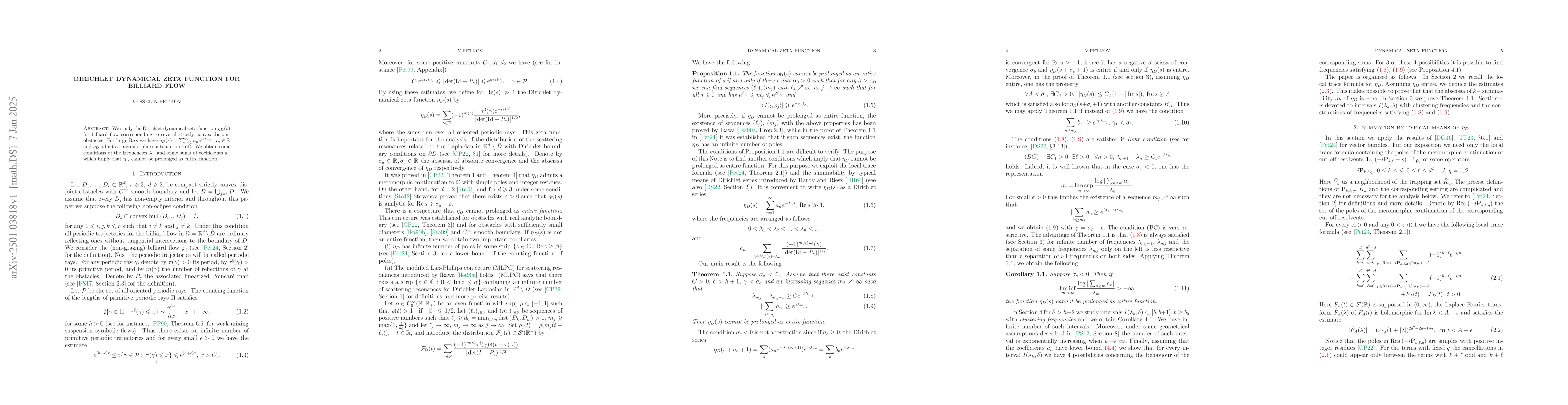 We study the Dirichlet dynamical zeta function $\eta_D(s)$ for billiard flow corresponding to several strictly convex disjoint obstacles. For large ${\rm Re}\: s$ we have $\eta_D(s) =\sum_{n= 1}^{\infty} a_n e^{-\lambda_n s}, \: a_n \in \mathbb R$ and $\eta_D$ admits a meromorphic continuation to $\mathbb C$. We obtain some conditions of the frequencies $\lambda_n$ and some sums of coefficients $a_n$ which imply that $\eta_D$ cannot be prolonged as entire function.