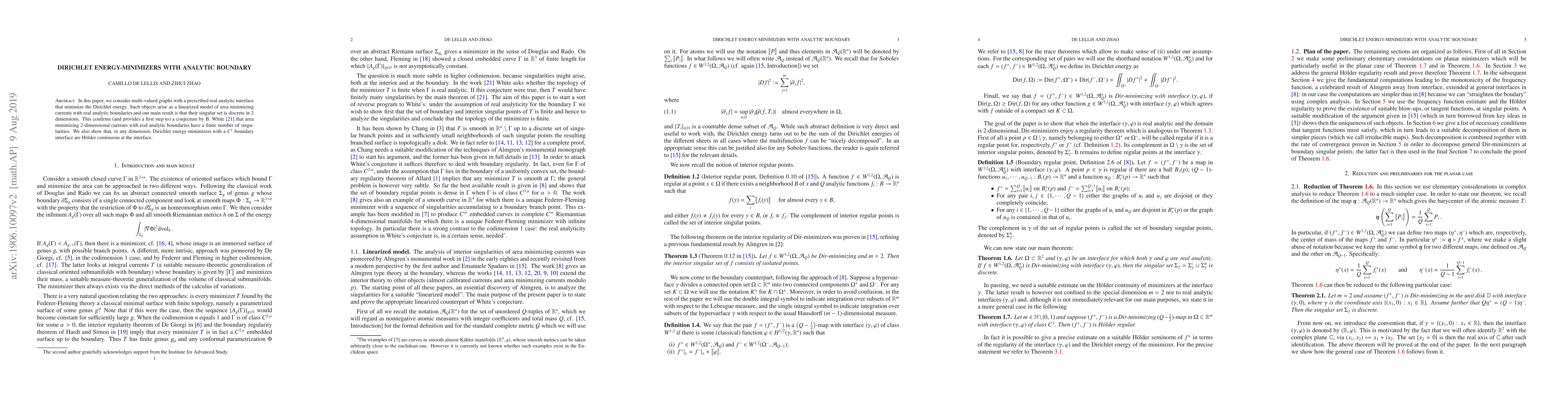 In this paper, we consider multi-valued graphs with a prescribed real analytic interface that minimize the Dirichlet energy. Such objects arise as a linearized model of area minimizing currents with real analytic boundaries and our main result is that their singular set is discrete in 2 dimensions. This confirms (and provides a first step to) a conjecture by B. White \cite{White97} that area minimizing $2$-dimensional currents with real analytic boundaries have a finite number of singularities. We also show that, in any dimension, Dirichlet energy-minimizers with a $C^1$ boundary interface are H\"older continuous at the interface.