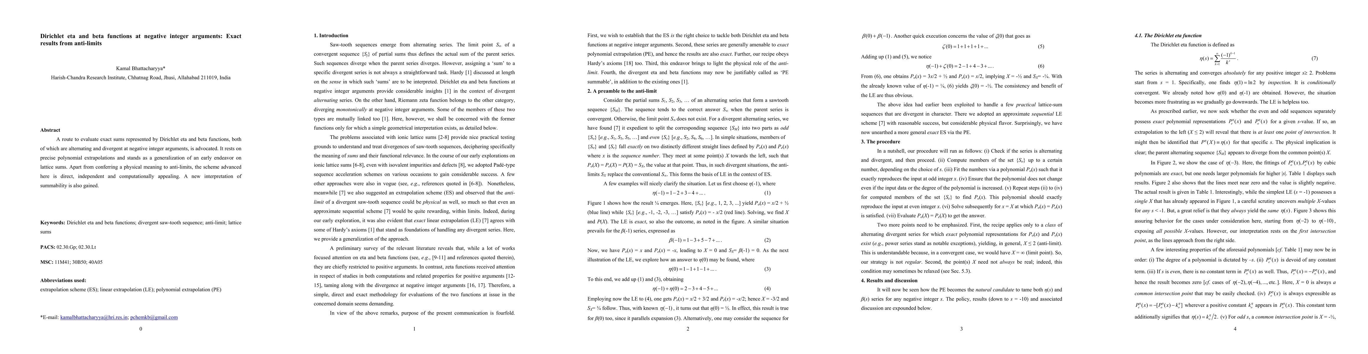Researchers developed a new method to calculate exact sums of Dirichlet eta and beta functions at negative integer arguments using polynomial extrapolations, offering a direct, independent, and computationally appealing approach with potential physical implications.