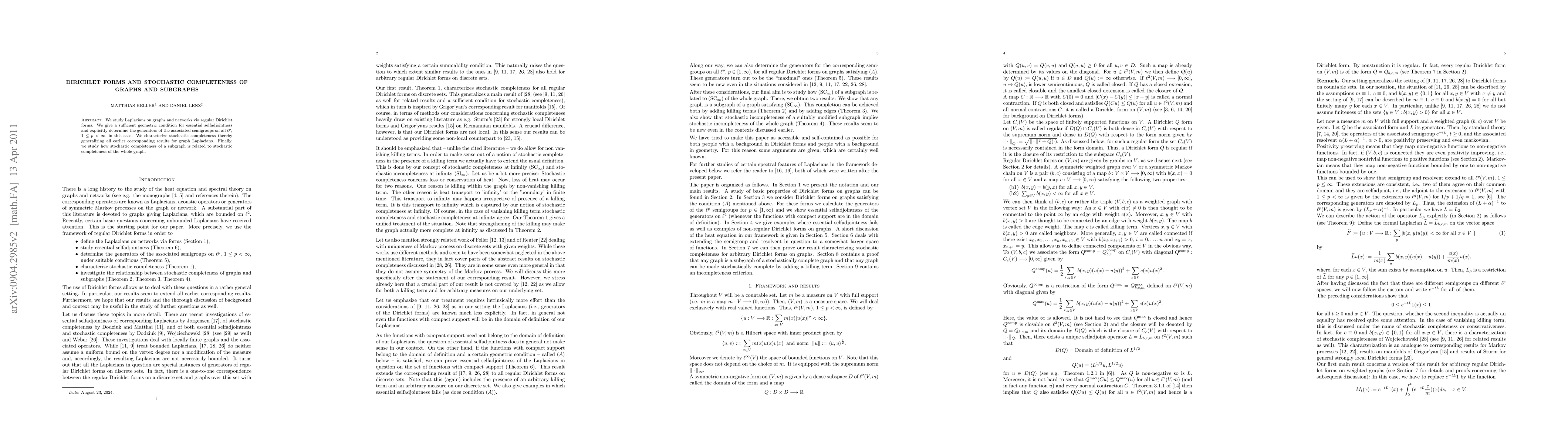 This paper investigates the relationship between Dirichlet forms and stochastic completeness in graphs and subgraphs, providing a sufficient geometric condition for essential self-adjointness and generalizing earlier results on graph Laplacians.