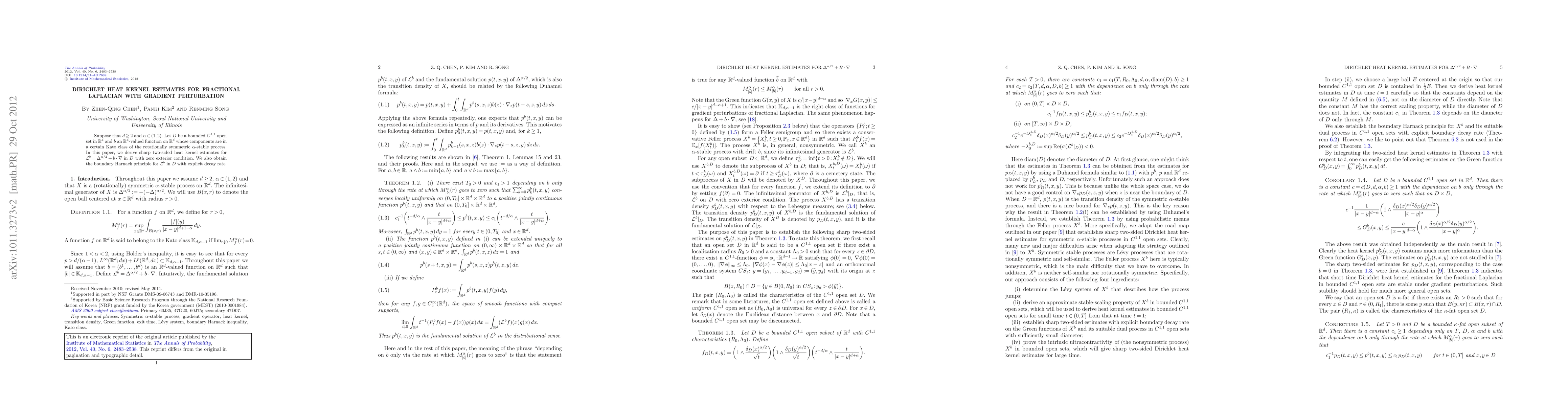 Suppose that $d\geq2$ and $\alpha\in(1,2)$. Let D be a bounded $C^{1,1}$ open set in $\mathbb{R}^d$ and b an $\mathbb{R}^d$-valued function on $\mathbb{R}^d$ whose components are in a certain Kato class of the rotationally symmetric \alpha-stable process. In this paper, we derive sharp two-sided heat kernel estimates for $\mathcal{L}^b=\Delta^{\alpha/2}+b\cdot\nabla$ in D with zero exterior condition. We also obtain the boundary Harnack principle for $\mathcal{L}^b$ in D with explicit decay rate.