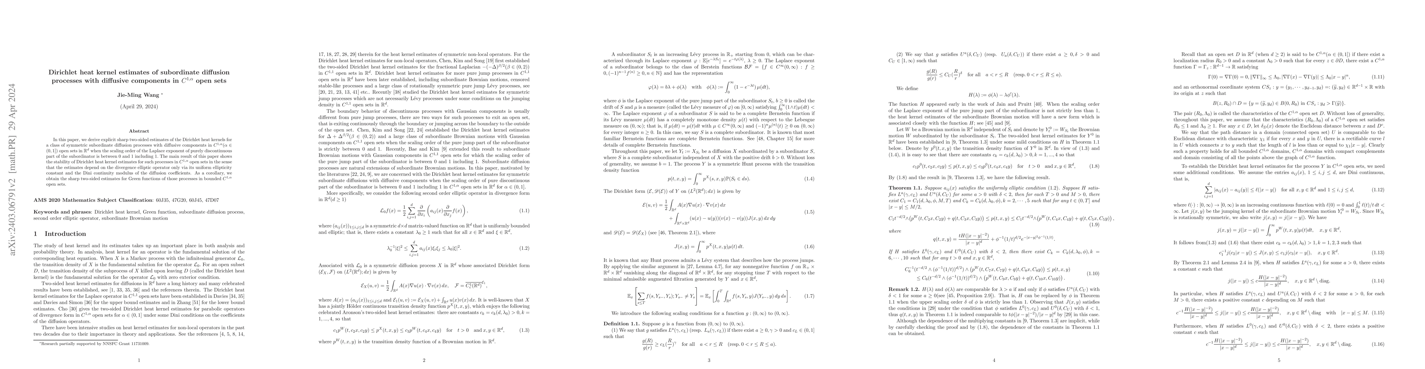 In this paper, we derive explicit sharp two-sided estimates of the Dirichlet heat kernels for a class of symmetric subordinate diffusion processes with diffusive components in $C^{1, \alpha}(\alpha\in (0, 1])$ open sets in $\mathbb R^d$ when the scaling order of the Laplace exponent of purely discontinuous part of the subordinator is between $0$ and $1$ including $1.$ The main result of this paper shows the stability of Dirichlet heat kernel estimates for such processes in $C^{1, \alpha}$ open sets in the sense that the estimates depend on the divergence elliptic operator only via its uniform ellipticity constant and the Dini continuity modulus of the diffusion coefficients. As a corollary, we obtain the sharp two-sided estimates for Green functions of those processes in bounded $C^{1, \alpha}$ open sets.