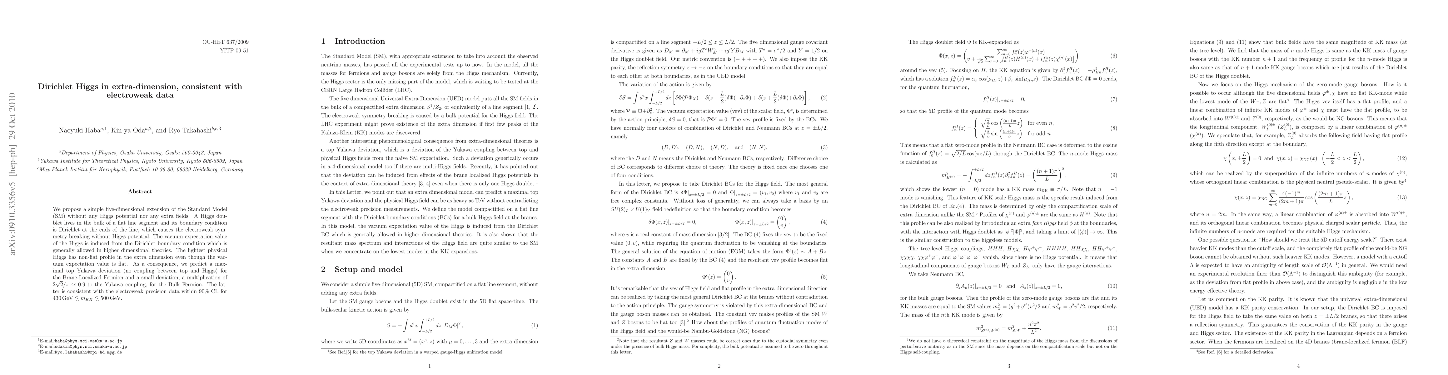 We propose a simple five-dimensional extension of the Standard Model (SM) without any Higgs potential nor any extra fields. A Higgs doublet lives in the bulk of a flat line segment and its boundary condition is Dirichlet at the ends of the line, which causes the electroweak symmetry breaking without Higgs potential. The vacuum expectation value of the Higgs is induced from the Dirichlet boundary condition which is generally allowed in higher dimensional theories. The lightest physical Higgs has non-flat profile in the extra dimension even though the vacuum expectation value is flat. As a consequence, we predict a maximal top Yukawa deviation (no coupling between top and Higgs) for the Brane-Localized Fermion and a small deviation, a multiplication of 2\sqrt{2}/\pi\simeq0.9 to the Yukawa coupling, for the Bulk Fermion. The latter is consistent with the electroweak precision data within 90% CL for 430GeV\lesssim m_{KK}\lesssim 500GeV.