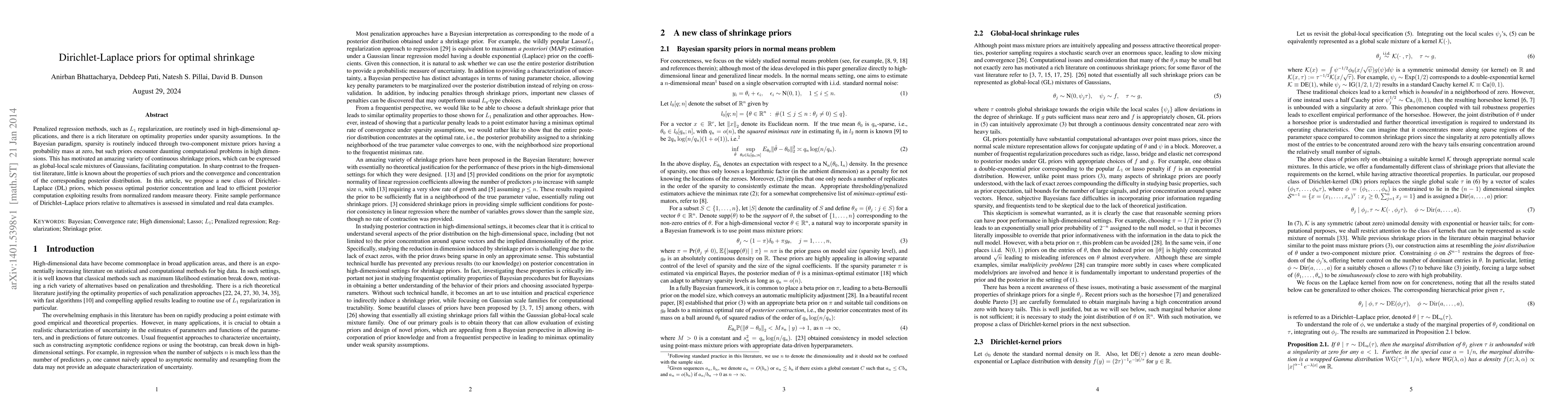 Penalized regression methods, such as $L_1$ regularization, are routinely used in high-dimensional applications, and there is a rich literature on optimality properties under sparsity assumptions. In the Bayesian paradigm, sparsity is routinely induced through two-component mixture priors having a probability mass at zero, but such priors encounter daunting computational problems in high dimensions. This has motivated an amazing variety of continuous shrinkage priors, which can be expressed as global-local scale mixtures of Gaussians, facilitating computation. In sharp contrast to the frequentist literature, little is known about the properties of such priors and the convergence and concentration of the corresponding posterior distribution. In this article, we propose a new class of Dirichlet--Laplace (DL) priors, which possess optimal posterior concentration and lead to efficient posterior computation exploiting results from normalized random measure theory. Finite sample performance of Dirichlet--Laplace priors relative to alternatives is assessed in simulated and real data examples.