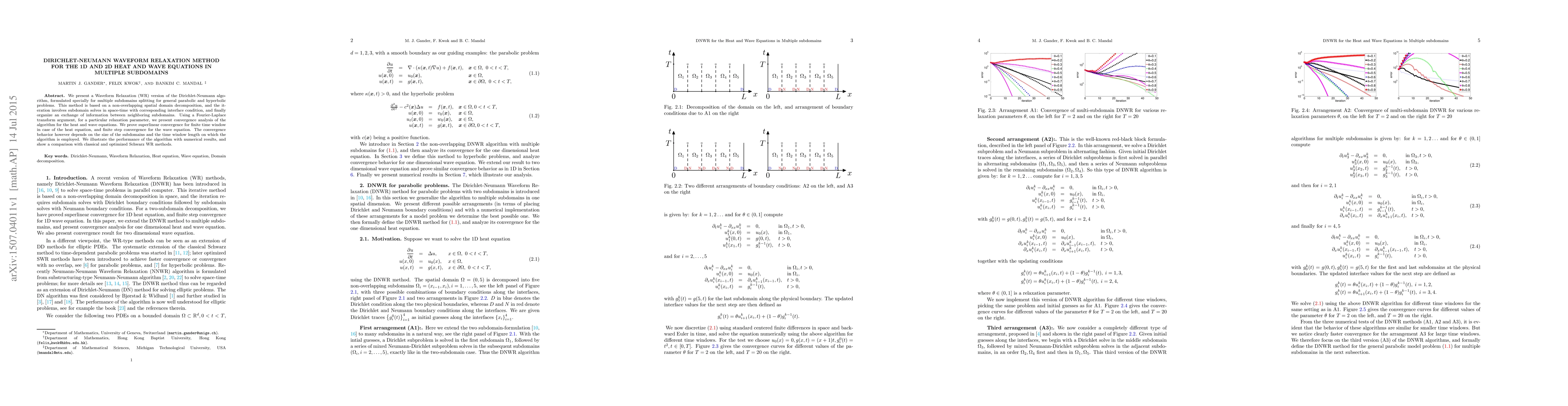 This paper introduces a Dirichlet-Neumann Waveform Relaxation method tailored for solving 1D and 2D heat and wave equations in multiple subdomains. The method demonstrates superlinear convergence for heat equations and finite step convergence for wave equations, with performance dependent on subdomain size and time window.