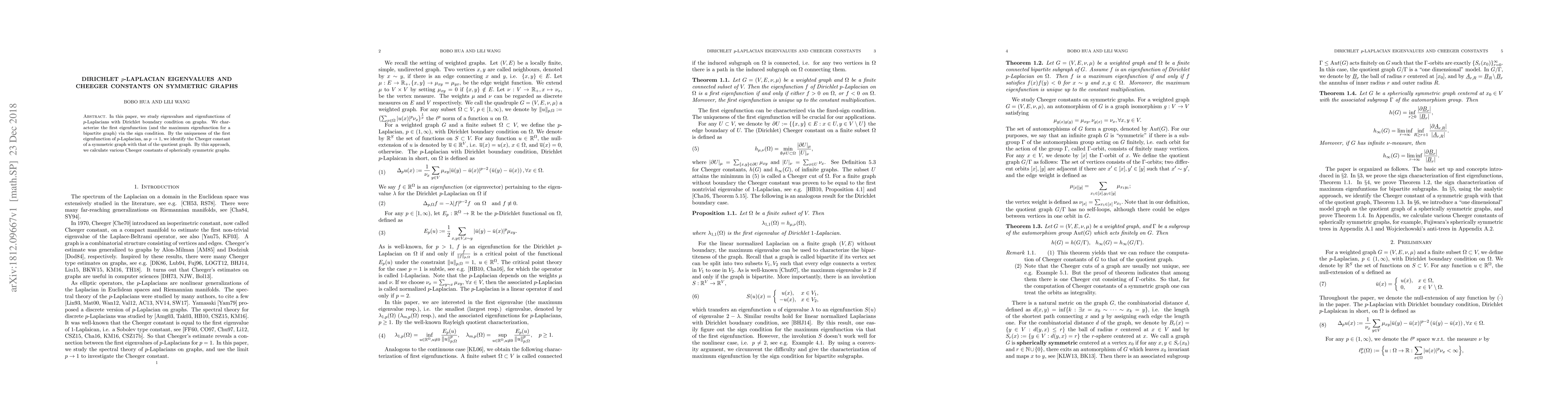 This paper investigates eigenvalues and eigenfunctions of $p$-Laplacians on graphs with Dirichlet boundary conditions, characterizing the first eigenfunction via sign conditions. It reveals the relationship between the Cheeger constant of a symmetric graph and that of its quotient graph as $p$ approaches 1, and calculates various Cheeger constants for spherically symmetric graphs.