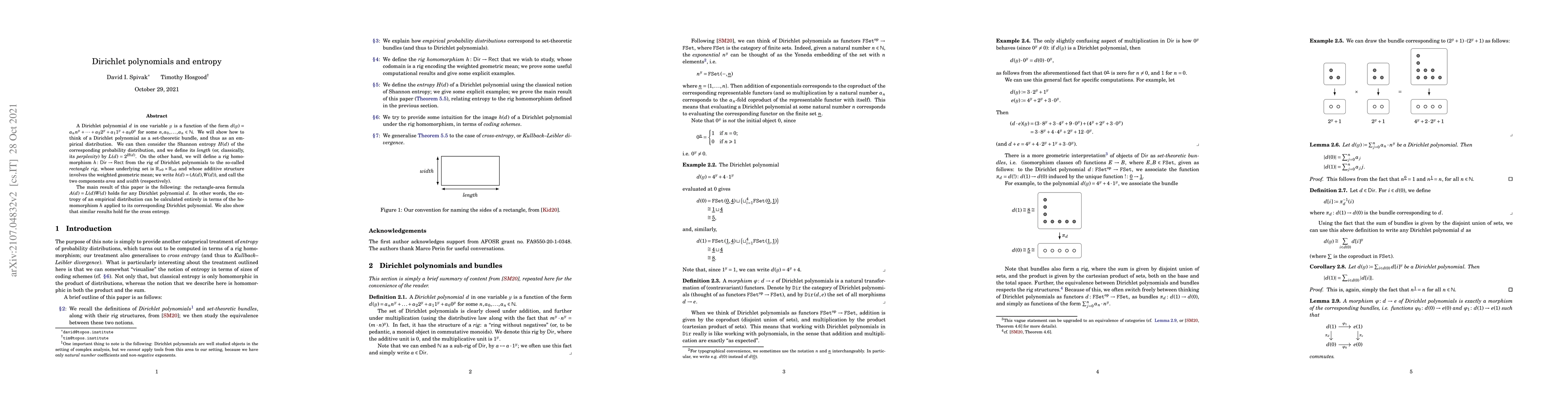 A Dirichlet polynomial $d$ in one variable ${\mathcal{y}}$ is a function of the form $d({\mathcal{y}})=a_n n^{\mathcal{y}}+\cdots+a_22^{\mathcal{y}}+a_11^{\mathcal{y}}+a_00^{\mathcal{y}}$ for some $n,a_0,\ldots,a_n\in\mathbb{N}$. We will show how to think of a Dirichlet polynomial as a set-theoretic bundle, and thus as an empirical distribution. We can then consider the Shannon entropy $H(d)$ of the corresponding probability distribution, and we define its length (or, classically, its perplexity) by $L(d)=2^{H(d)}$. On the other hand, we will define a rig homomorphism $h\colon\mathsf{Dir}\to\mathsf{Rect}$ from the rig of Dirichlet polynomials to the so-called rectangle rig, whose underlying set is $\mathbb{R}_{\geq0}\times\mathbb{R}_{\geq0}$ and whose additive structure involves the weighted geometric mean; we write $h(d)=(A(d),W(d))$, and call the two components area and width (respectively). The main result of this paper is the following: the rectangle-area formula $A(d)=L(d)W(d)$ holds for any Dirichlet polynomial $d$. In other words, the entropy of an empirical distribution can be calculated entirely in terms of the homomorphism $h$ applied to its corresponding Dirichlet polynomial. We also show that similar results hold for the cross entropy.