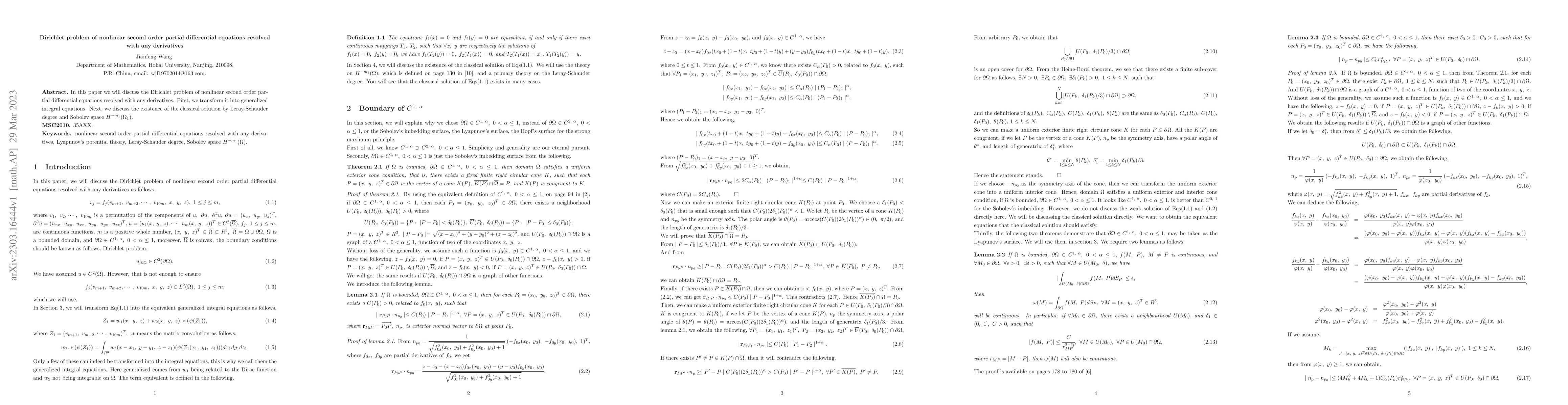 Summary: This paper tackles the Dirichlet problem for nonlinear second-order partial differential equations using any derivatives, transforming it into generalized integral equations. It then establishes the existence of classical solutions through Leray-Schauder degree and in the Sobolev space $H^{-m_{1}}(\Omega_{1})$.