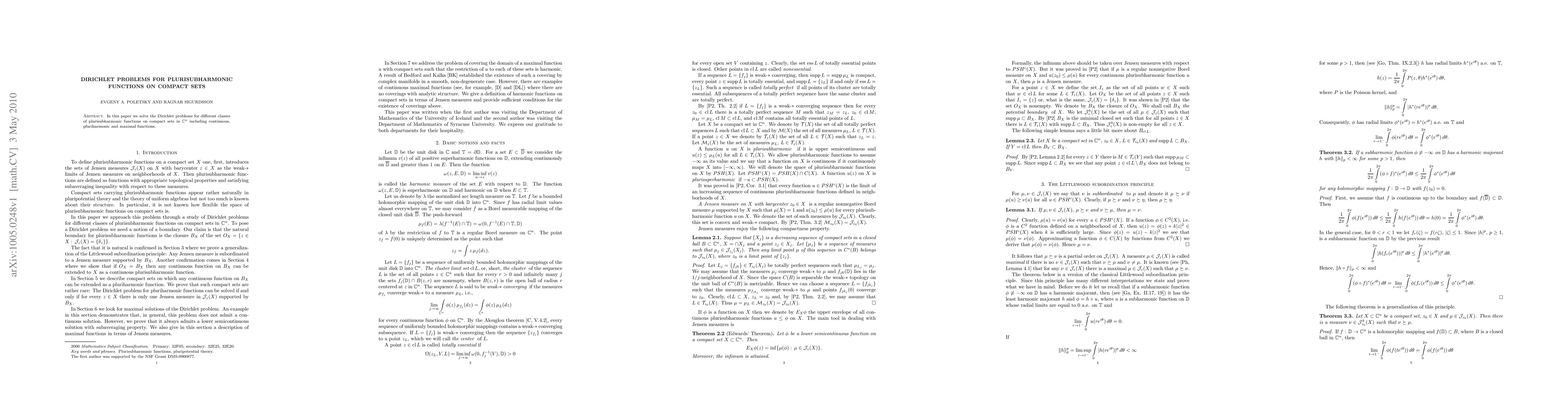 This paper resolves Dirichlet problems for various types of plurisubharmonic functions on compact sets within $\mathbb{C}^n$, focusing on continuous, pluriharmonic, and maximal functions. The methodology provides a comprehensive solution framework for these classes of functions.