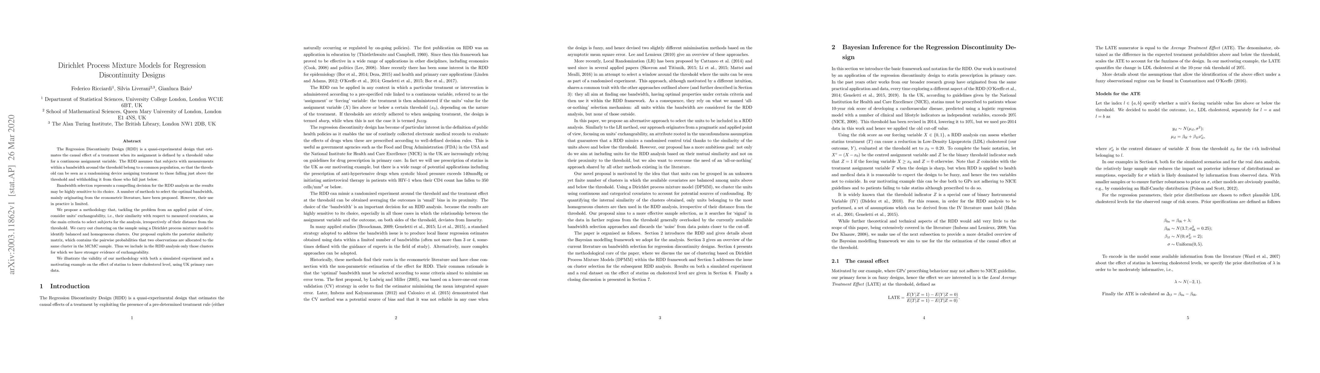 The Regression Discontinuity Design (RDD) is a quasi-experimental design that estimates the causal effect of a treatment when its assignment is defined by a threshold value for a continuous assignment variable. The RDD assumes that subjects with measurements within a bandwidth around the threshold belong to a common population, so that the threshold can be seen as a randomising device assigning treatment to those falling just above the threshold and withholding it from those who fall just below. Bandwidth selection represents a compelling decision for the RDD analysis as the results may be highly sensitive to its choice. A number of methods to select the optimal bandwidth, mainly originating from the econometric literature, have been proposed. However, their use in practice is limited. We propose a methodology that, tackling the problem from an applied point of view, consider units' exchangeability, i.e., their similarity with respect to measured covariates, as the main criteria to select subjects for the analysis, irrespectively of their distance from the threshold. We carry out clustering on the sample using a Dirichlet process mixture model to identify balanced and homogeneous clusters. Our proposal exploits the posterior similarity matrix, which contains the pairwise probabilities that two observations are allocated to the same cluster in the MCMC sample. Thus we include in the RDD analysis only those clusters for which we have stronger evidence of exchangeability. We illustrate the validity of our methodology with both a simulated experiment and a motivating example on the effect of statins to lower cholesterol level, using UK primary care data.