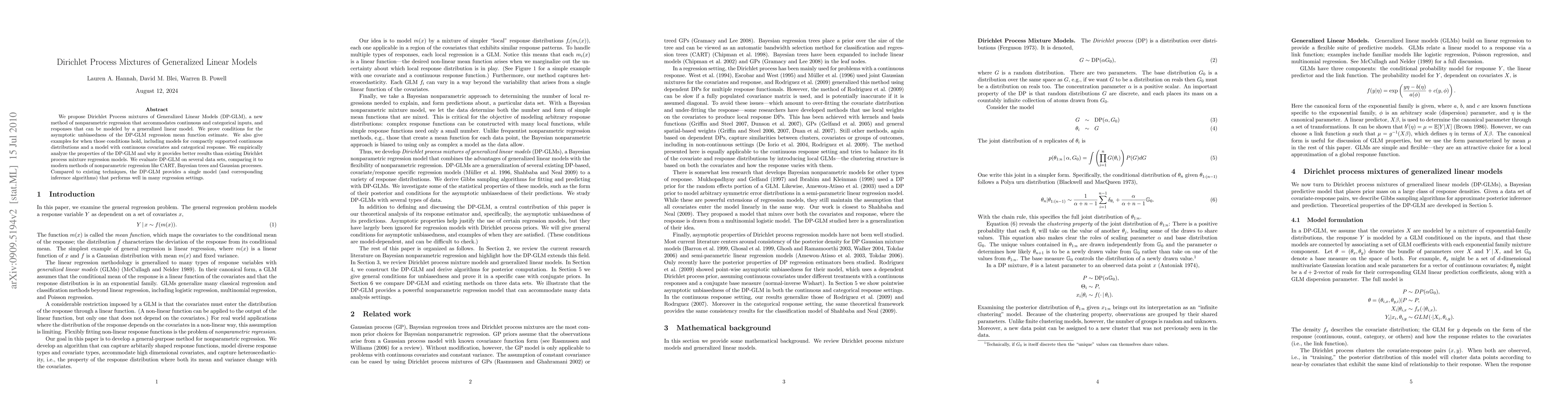 The paper proposes Dirichlet Process Mixtures of Generalized Linear Models (DP-GLM), a nonparametric regression method accommodating continuous and categorical inputs and responses modeled by a generalized linear model. It provides conditions for the asymptotic unbiasedness of the DP-GLM regression mean function estimate.