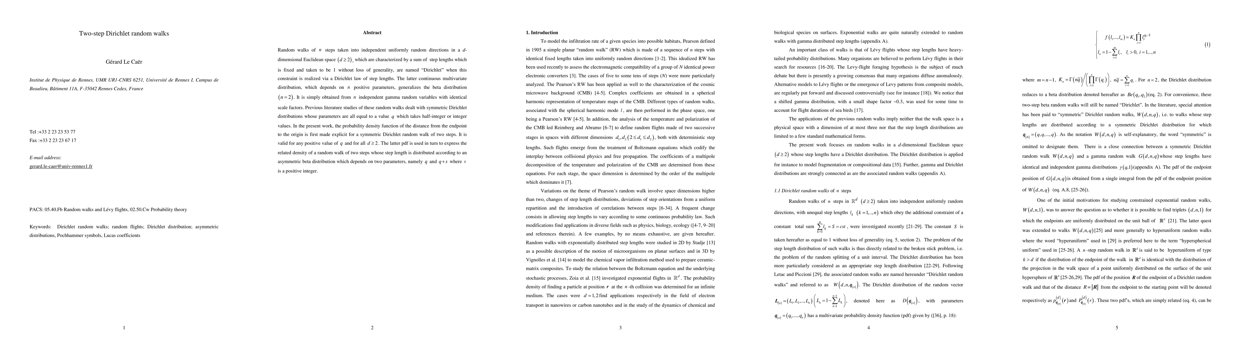 Random walks of n steps taken into independent uniformly random directions in a d-dimensional Euclidean space (d larger than 1), are named Dirichlet when their step lengths are distributed according to a Dirichlet law. The latter continuous multivariate distribution, which depends on n positive parameters, generalizes the beta distribution (n=2). The sum of step lengths is thus fixed and equal to 1. In the present work, the probability density function of the distance from the endpoint to the origin is first made explicit for a symmetric Dirichlet random walk of two steps which depends on a single positive parameter q. It is valid for any positive q and for all d larger than 1. The latter pdf is used in turn to express the related density of a random walk of two steps whose step length is distributed according to an asymmetric beta distribution which depends on two parameters, namely q and q+s where s is a positive integer.