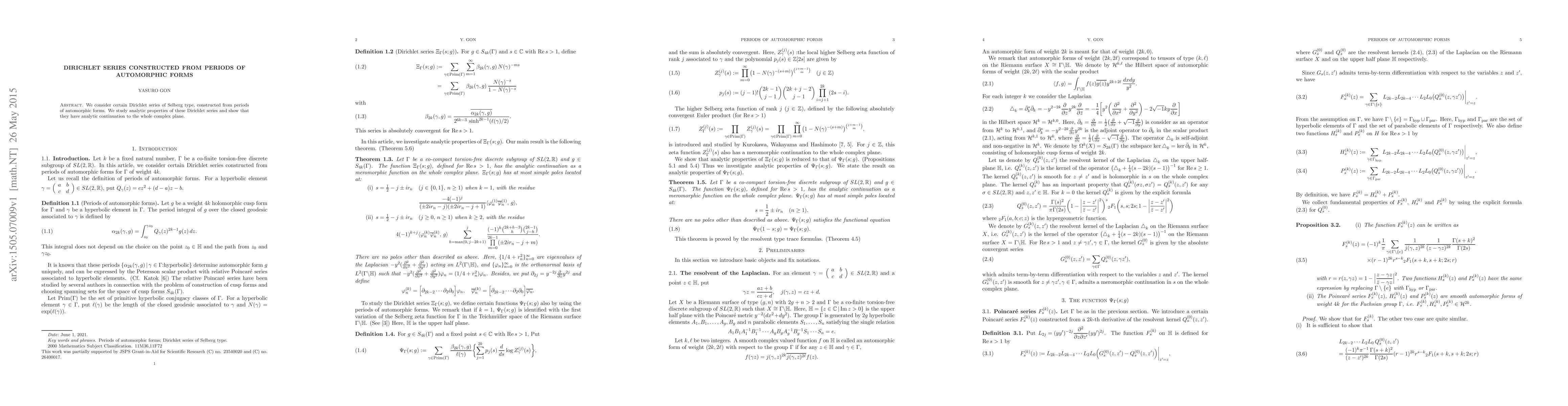 Summary: This paper investigates Dirichlet series derived from periods of automorphic forms, demonstrating their analytic continuation to the entire complex plane and exploring their associated properties.
