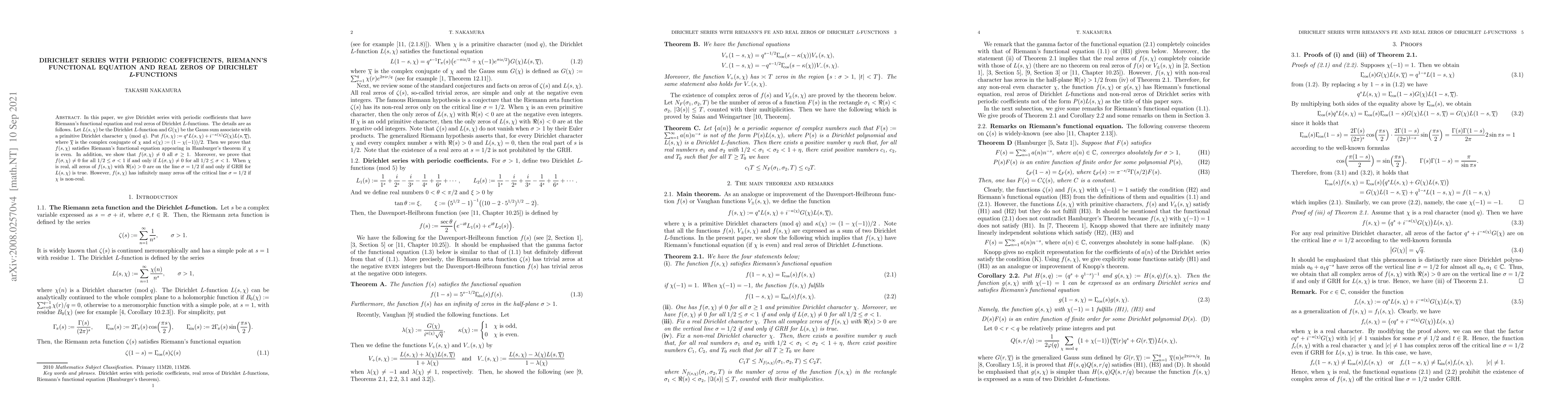 In this paper, we give Dirichlet series with periodic coefficients that have Riemann's functional equation and real zeros of Dirichlet $L$-functions. The details are as follows. Let $L(s,\chi)$ be the Dirichlet $L$-function and $G(\chi)$ be the Gauss sum associate with a primitive Dirichlet character $\chi$ (${\rm{mod}} \,\, q$). Put $f (s,\chi) := q^s L(s,\chi) + i^{-\kappa (\chi)} G(\chi) L(s,\overline{\chi})$, where $\overline{\chi}$ is the complex conjugate of $\chi$ and $\kappa (\chi) :=(1-\chi (-1))/2$. Then we prove that $f (s,\chi)$ satisfies Riemann's functional equation appearing in Hamburger's theorem if $\chi$ is even. In addition, we show that $f (\sigma,\chi) \ne 0$ all $\sigma \ge 1$. Moreover, we prove that $f(\sigma,\chi) \ne 0$ for all $1/2 \le \sigma < 1$ if and only if $L(\sigma,\chi) \ne 0$ for all $1/2 \le \sigma < 1$. When $\chi$ is real, all zeros of $f(s,\chi)$ with $\Re (s) >0$ are on the line $\sigma =1/2$ if and only if GRH for $L(s,\chi)$ is true. However, $f (s,\chi)$ has infinitely many zeros off the critical line $\sigma =1/2$ if $\chi$ is non-real.