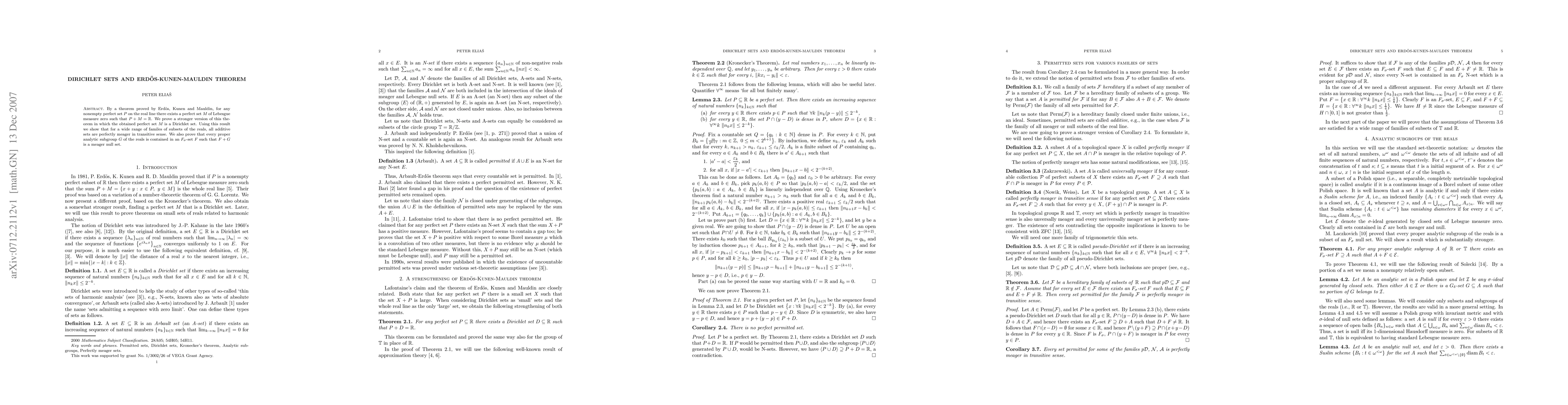 By a theorem proved by Erdos, Kunen and Mauldin, for any nonempty perfect set $P$ on the real line there exists a perfect set $M$ of Lebesgue measure zero such that $P+M=\mathbb{R}$. We prove a stronger version of this theorem in which the obtained perfect set $M$ is a Dirichlet set. Using this result we show that for a wide range of familes of subsets of the reals, all additive sets are perfectly meager in transitive sense. We also prove that every proper analytic subgroup $G$ of the reals is contained in an F-sigma set $F$ such that $F+G$ is a meager null set.