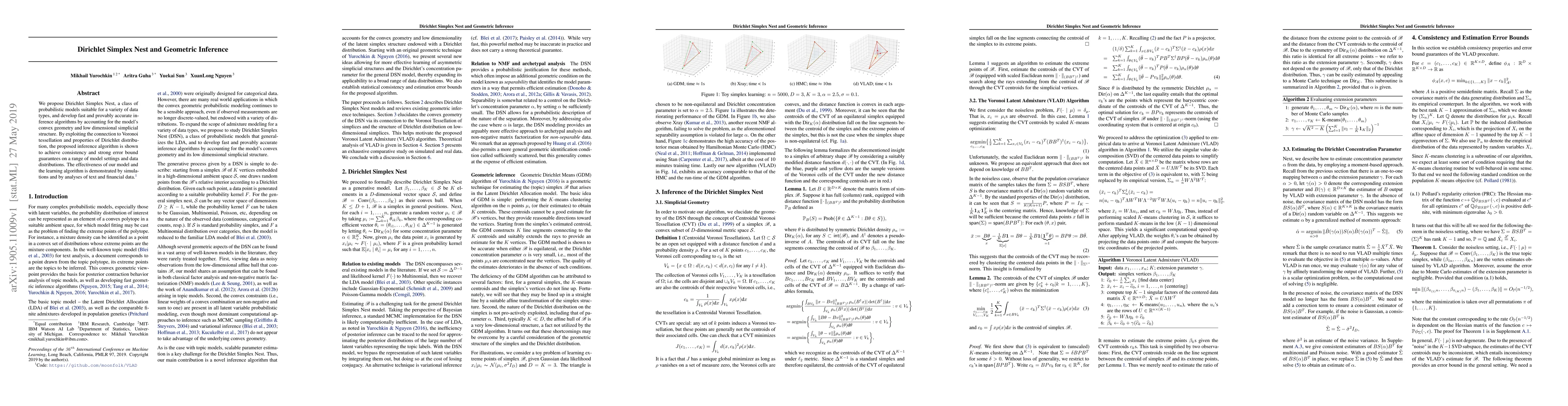 We propose Dirichlet Simplex Nest, a class of probabilistic models suitable for a variety of data types, and develop fast and provably accurate inference algorithms by accounting for the model's convex geometry and low dimensional simplicial structure. By exploiting the connection to Voronoi tessellation and properties of Dirichlet distribution, the proposed inference algorithm is shown to achieve consistency and strong error bound guarantees on a range of model settings and data distributions. The effectiveness of our model and the learning algorithm is demonstrated by simulations and by analyses of text and financial data.