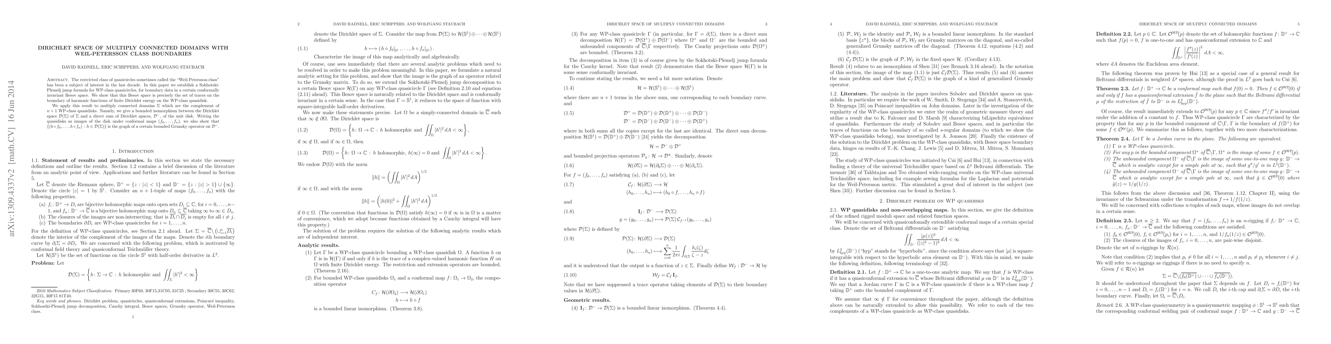 The restricted class of quasicircles sometimes called the "Weil-Petersson-class" has been a subject of interest in the last decade. In this paper we establish a Sokhotski-Plemelj jump formula for WP-class quasicircles, for boundary data in a certain conformally invariant Besov space. We show that this Besov space is precisely the set of traces on the boundary of harmonic functions of finite Dirichlet energy on the WP-class quasidisk. We apply this result to multiply connected domains, Sigma, which are the complement of n+1 WP-class quasidisks. Namely, we give a bounded isomorphism between the Dirichlet space D(Sigma) of Sigma and a direct sum of Dirichlet spaces, D-, of the unit disk. Writing the quasidisks as images of the disk under conformal maps (f_0,...,f_n), we also show that {(h \circ f_0,...,h \circ f_n) : h \in D(Sigma)} is the graph of a certain bounded Grunsky operator on D-.