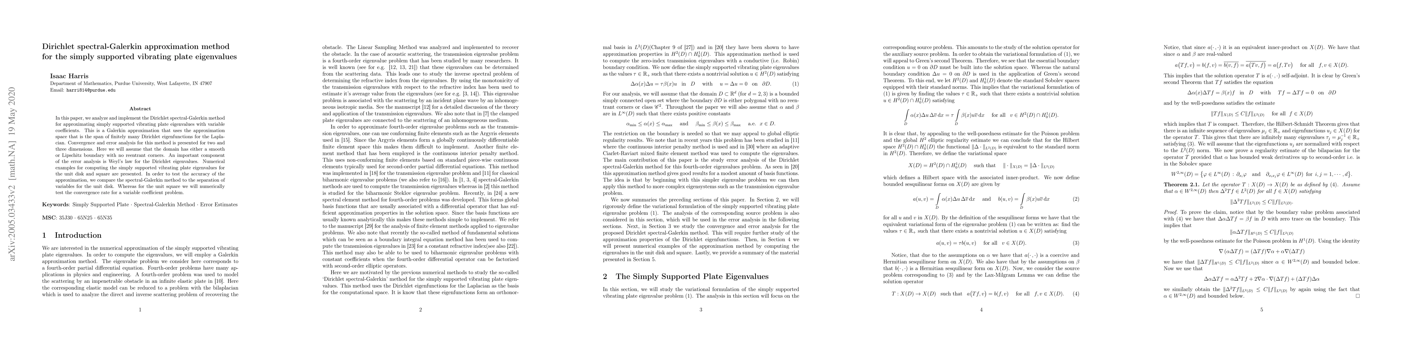 In this paper, we analyze and implement the Dirichlet spectral-Galerkin method for approximating simply supported vibrating plate eigenvalues with variable coefficients. This is a Galerkin approximation that uses the approximation space that is the span of finitely many Dirichlet eigenfunctions for the Laplacian. Convergence and error analysis for this method is presented for two and three dimensions. Here we will assume that the domain has either a smooth or Lipschitz boundary with no reentrant corners. An important component of the error analysis is Weyl's law for the Dirichlet eigenvalues. Numerical examples for computing the simply supported vibrating plate eigenvalues for the unit disk and square are presented. In order to test the accuracy of the approximation, we compare the spectral-Galerkin method to the separation of variables for the unit disk. Whereas for the unit square we will numerically test the convergence rate for a variable coefficient problem.