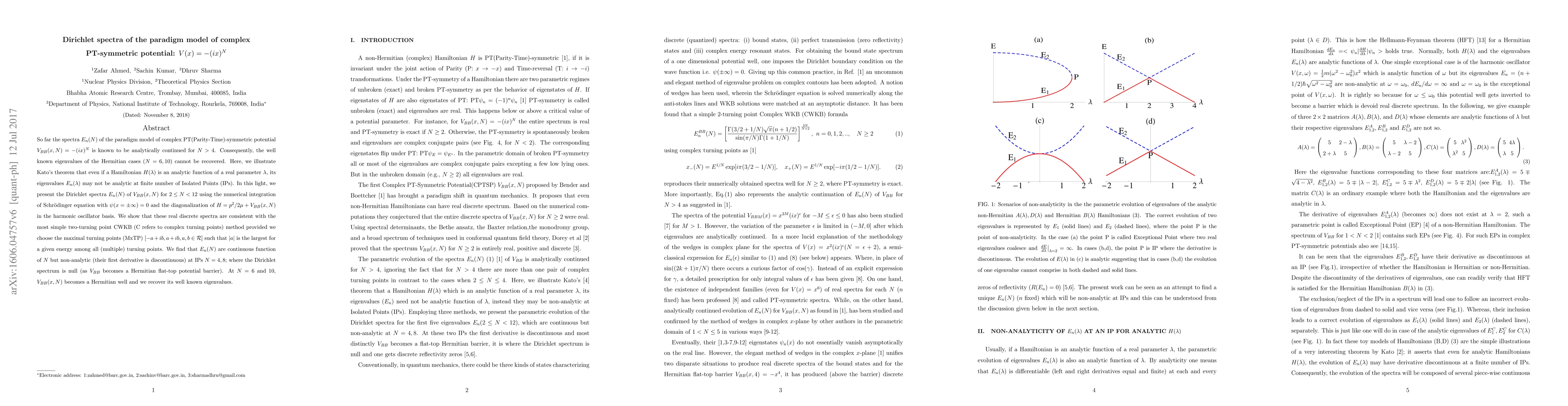 So far the spectra $E_n(N)$ of the paradigm model of complex PT(Parity-Time)-symmetric potential $V_{BB}(x,N)=-(ix)^N$ is known to be analytically continued for $N > 4$. Consequently, the well known eigenvalues of the Hermitian cases ($N=6,10$) cannot be recovered. Here, we illustrate Kato's theorem that even if a Hamiltonian $H(\lambda)$ is an analytic function of a real parameter $\lambda$, its eigenvalues $E_n(\lambda)$ may not be analytic at finite number of Isolated Points (IPs). In this light, we present the Dirichlet spectra $E_n(N)$ of $V_{BB}(x,N)$ for $2\le N<12$ using the numerical integration of Schr{\"o}dinger equation with $\psi(x=\pm \infty)=0$ and the diagonalization of $H=p^2/2\mu+V_{BB}(x,N)$ in the harmonic oscillator basis. We show that these real discrete spectra are consistent with the most simple two-turning point CWKB (C refers to complex turning points) method provided we choose the maximal turning points (MxTP) [$-a+ib,a+ib, a, b \in {\cal R}$] such that $|a|$ is the largest for a given energy among all (multiple) turning points. We find that $E_n(N)$ are continuous function of $N$ but non-analytic (their first derivative is discontinuous) at IPs $N=4,8$; where the Dirichlet spectrum is null (as $V_{BB}$ becomes a Hermitian flat-top potential barrier). At $N=6$ and $10$, $V_{BB}(x,N)$ becomes a Hermitian well and we recover its well known eigenvalues.