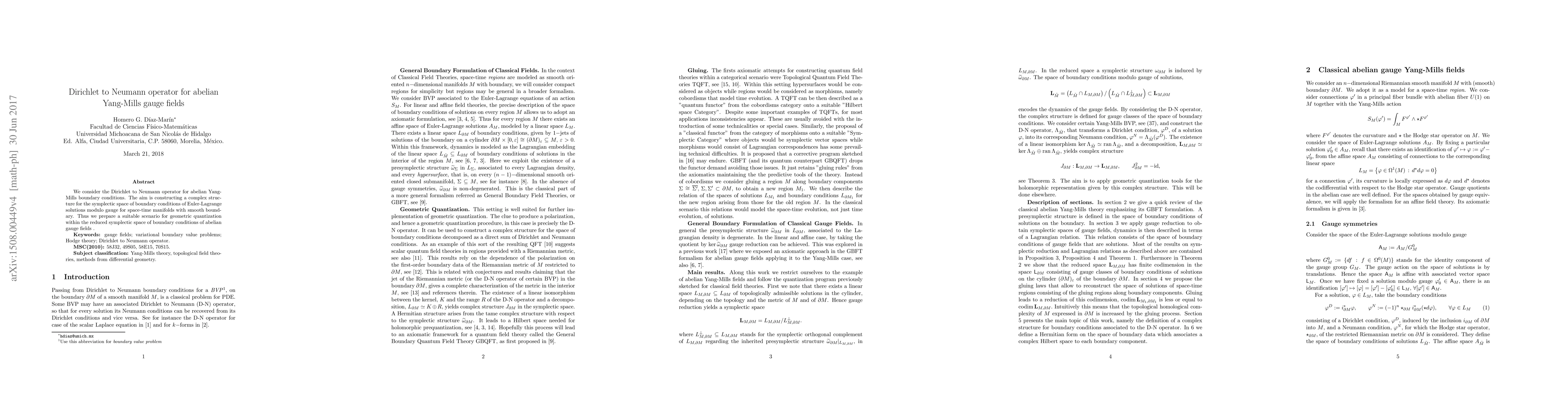 This paper explores the Dirichlet to Neumann operator for abelian Yang-Mills gauge fields on manifolds with smooth boundaries, aiming to construct a complex structure for the symplectic space of boundary conditions. This work sets the stage for geometric quantization of abelian gauge fields via symplectic reduction in a Lagrangian framework.
