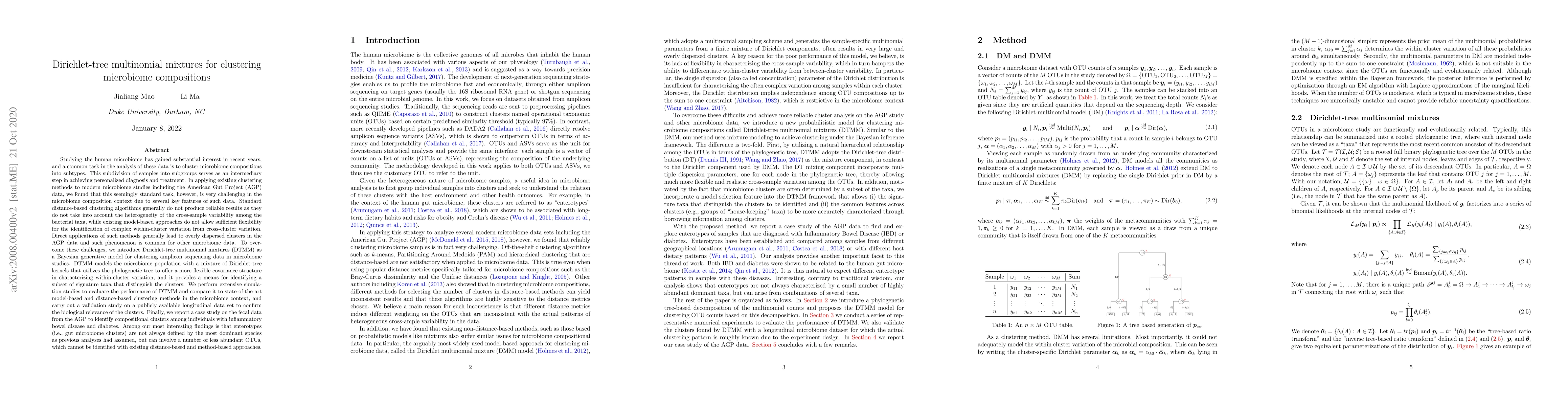 The paper introduces Dirichlet-tree multinomial mixtures (DTMM) as a Bayesian generative model for clustering microbiome compositions, addressing the limitations of existing methods in capturing complex within-cluster variation. DTMM utilizes a phylogenetic tree to model flexible covariance structures and identifies signature taxa, demonstrated through simulations and a case study on American Gut Project data.