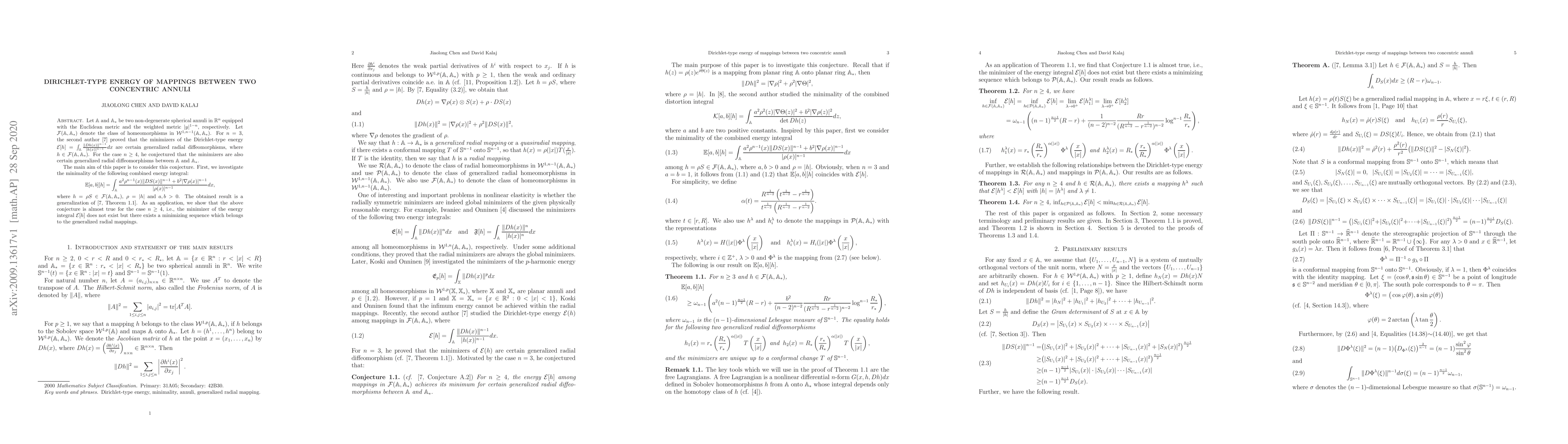 Let $\mathbb{A}$ and $\mathbb{A_{*}}$ be two non-degenerate spherical annuli in $\mathbb{R}^{n}$ equipped with the Euclidean metric and the weighted metric $|y|^{1-n}$, respectively. Let $\mathcal{F}(\mathbb{A},\mathbb{A_{*}})$ denote the class of homeomorphisms in $\mathcal{W}^{1,n-1}(\mathbb{A},\mathbb{A_{*}})$. For $n=3$, the second author \cite{kalaj2018} proved that the minimizers of the Dirichlet-type energy $\mathcal{E}[h]=\int_{\mathbb{A}} \frac{\|Dh(x)\|^{n-1}}{|h(x)|^{n-1}}dx$ are certain generalized radial diffeomorphisms, where $h\in \mathcal{F}(\mathbb{A},\mathbb{A_{*}})$. For the case $n\geq 4$, he conjectured that the minimizers are also certain generalized radial diffeomorphisms between $\mathbb{A}$ and $\mathbb{A_{*}}$. The main aim of this paper is to consider this conjecture. First, we investigate the minimality of the following combined energy integral: $$ \mathbb{E}[a,b][h] =\int_{\mathbb{A}}\frac{a^{2}\rho^{n-1}(x)\|DS(x)\|^{n-1}+b^{2}|\nabla \rho(x)|^{n-1}}{|\rho(x)|^{n-1}}dx, $$ where $h=\rho S\in \mathcal{F}(\mathbb{A},\mathbb{A_{*}})$, $\rho=|h|$ and $a,b>0$. The obtained result is a generalization of \cite[Theorem 1.1]{kalaj2018}. As an application, we show that the above conjecture is almost true for the case $n\geq 4$, i.e., the minimizer of the energy integral $\mathcal{E}[h]$ does not exist but there exists a minimizing sequence which belongs to the generalized radial mappings.