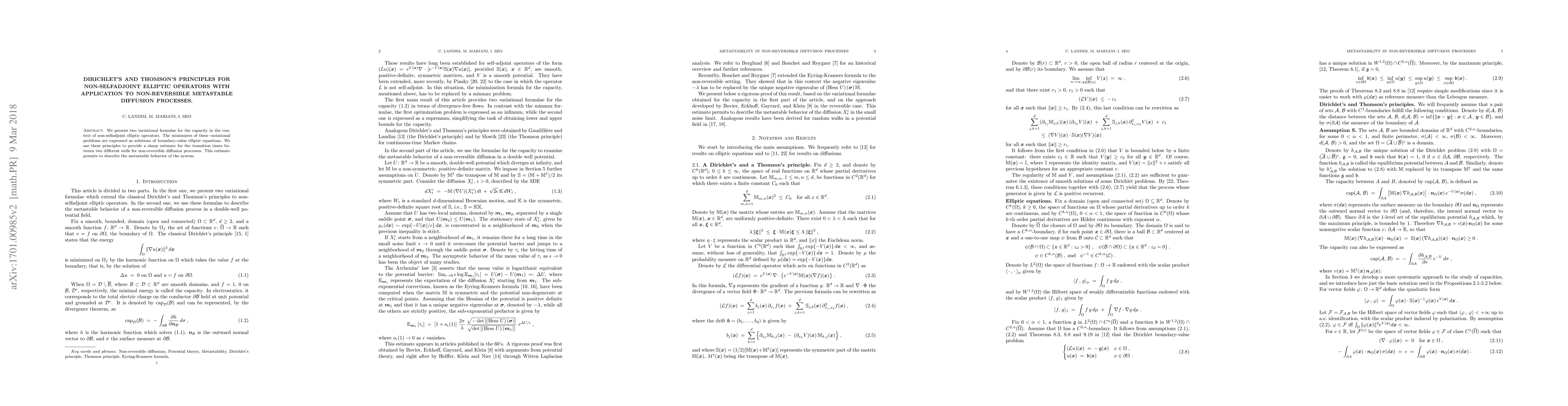 We present two variational formulae for the capacity in the context of non-selfadjoint elliptic operators. The minimizers of these variational problems are expressed as solutions of boundary-value elliptic equations. We use these principles to provide a sharp estimate for the transition times between two different wells for non-reversible diffusion processes. This estimate permits to describe the metastable behavior of the system.