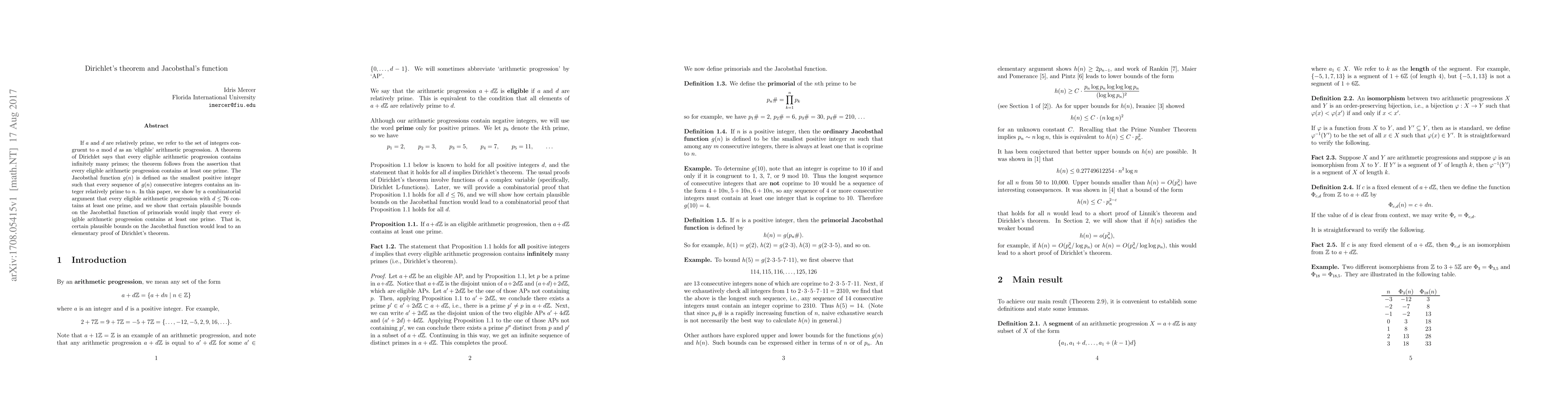 If $a$ and $d$ are relatively prime, we refer to the set of integers congruent to $a$ mod $d$ as an `eligible' arithmetic progression. A theorem of Dirichlet says that every eligible arithmetic progression contains infinitely many primes; the theorem follows from the assertion that every eligible arithmetic progression contains at least one prime. The Jacobsthal function $g(n)$ is defined as the smallest positive integer such that every sequence of $g(n)$ consecutive integers contains an integer relatively prime to $n$. In this paper, we show by a combinatorial argument that every eligible arithmetic progression with $d\le76$ contains at least one prime, and we show that certain plausible bounds on the Jacobsthal function of primorials would imply that every eligible arithmetic progression contains at least one prime. That is, certain plausible bounds on the Jacobsthal function would lead to an elementary proof of Dirichlet's theorem.