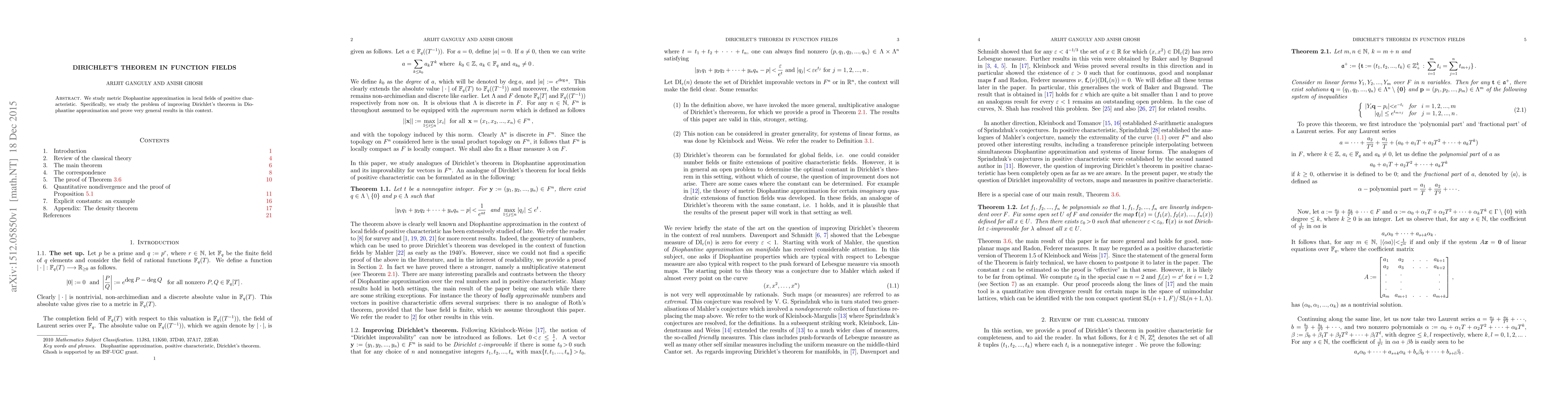 Summary: This paper investigates metric Diophantine approximation in local fields of positive characteristic, focusing on enhancing Dirichlet's theorem in this context and establishing broad, general results.