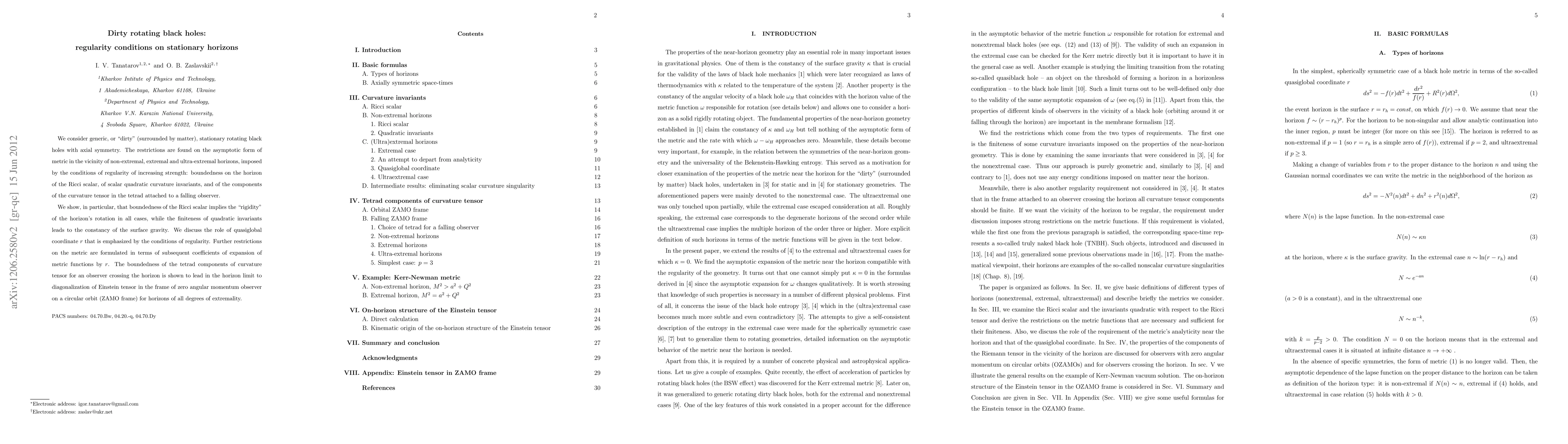 We consider generic, or "dirty" (surrounded by matter), stationary rotating black holes with axial symmetry. The restrictions are found on the asymptotic form of metric in the vicinity of non-extremal, extremal and ultra-extremal horizons, imposed by the conditions of regularity of increasing strength: boundedness on the horizon of the Ricci scalar, of scalar quadratic curvature invariants, and of the components of the curvature tensor in the tetrad attached to a falling observer. We show, in particular, that boundedness of the Ricci scalar implies the "rigidity" of the horizon's rotation in all cases, while the finiteness of quadratic invariants leads to the constancy of the surface gravity. We discuss the role of quasiglobal coordinate r that is emphasized by the conditions of regularity. Further restrictions on the metric are formulated in terms of subsequent coefficients of expansion of metric functions by r. The boundedness of the tetrad components of curvature tensor for an observer crossing the horizon is shown to lead in the horizon limit to diagonalization of Einstein tensor in the frame of zero angular momentum observer on a circular orbit (ZAMO frame) for horizons of all degrees of extremality.