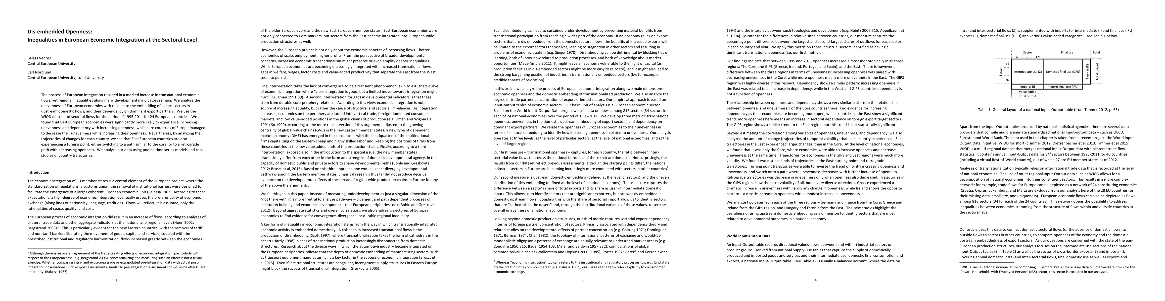 The process of European integration resulted in a marked increase in transnational economic flows, yet regional inequalities along many developmental indicators remain. We analyze the unevenness of European economies with respect to the embedding of export sectors in upstream domestic flows, and their dependency on dominant export partners. We use the WIOD data set of sectoral flows for the period of 1995-2011 for 24 European countries. We found that East European economies were significantly more likely to experience increasing unevenness and dependency with increasing openness, while core countries of Europe managed to decrease their unevenness while increasing their openness. Nevertheless, by analyzing the trajectories of changes for each country, we see that East European countries are also experiencing a turning point, either switching to a path similar to the core, or to a retrograde path with decreasing openness. We analyze our data using pooled time series models and case studies of country trajectories.