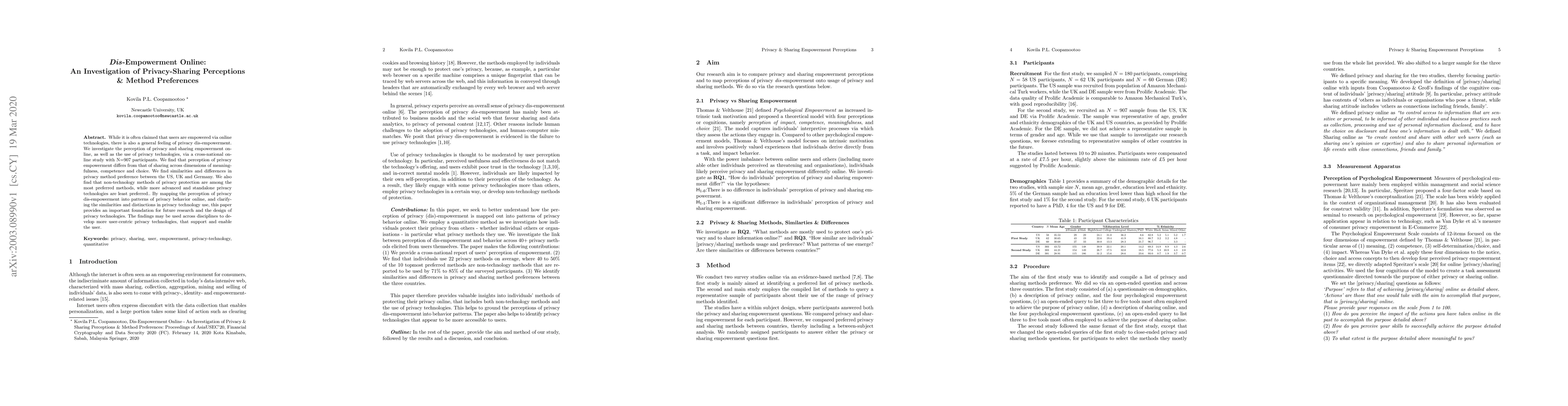 A study of 907 participants found that online users perceive privacy empowerment differently from sharing empowerment, with non-technology methods preferred over advanced privacy technologies.