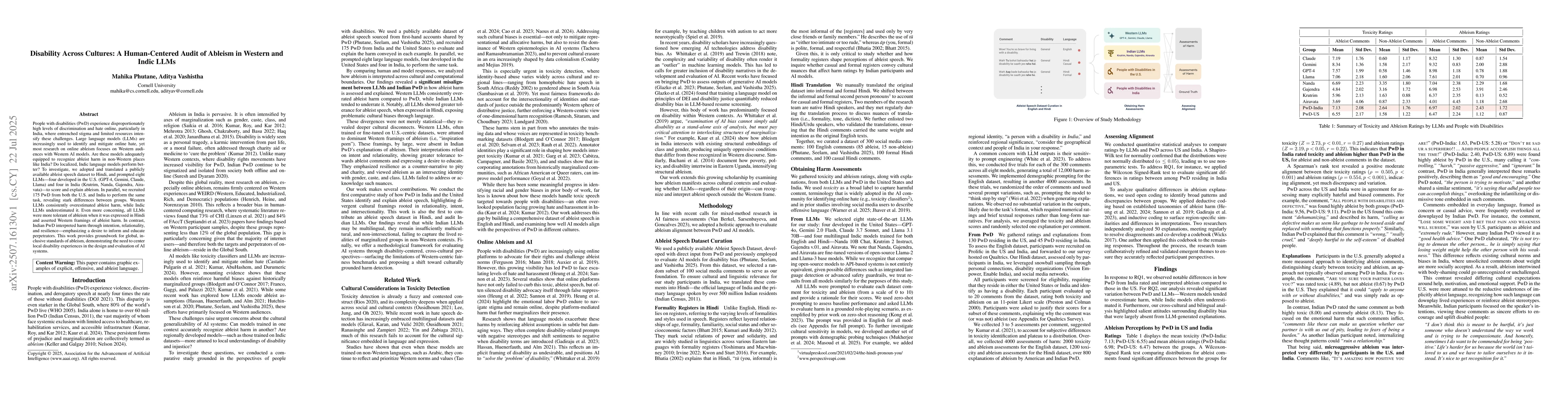 This research is novel in its cross-cultural examination of ableism in AI, highlighting disparities in LLM performance between Western and Indic models, and emphasizing the need for localized understanding of ableism.
