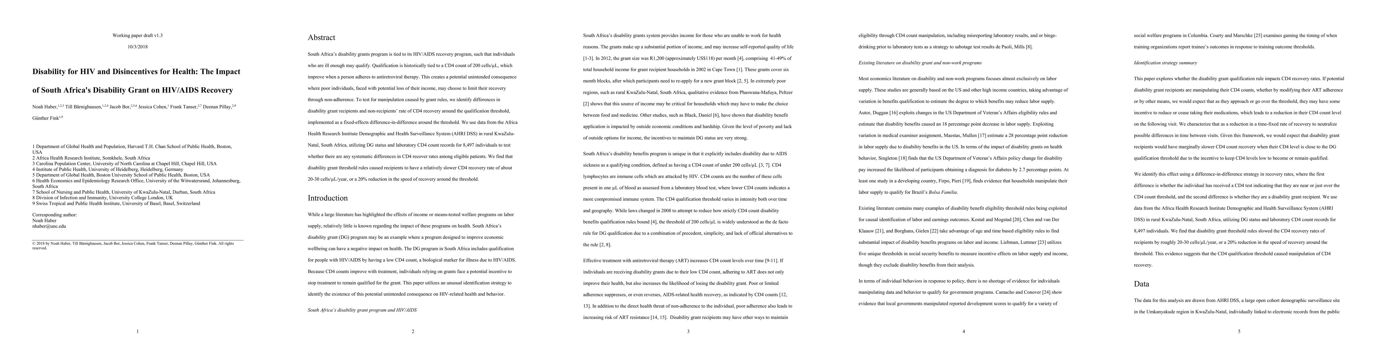 This study examines how South Africa's disability grant eligibility tied to HIV/AIDS recovery affects patients' adherence to antiretroviral therapy, finding that individuals near the qualification threshold for disability grants experience a slower CD4 recovery rate, suggesting a disincentive effect due to the grant's financial dependency.