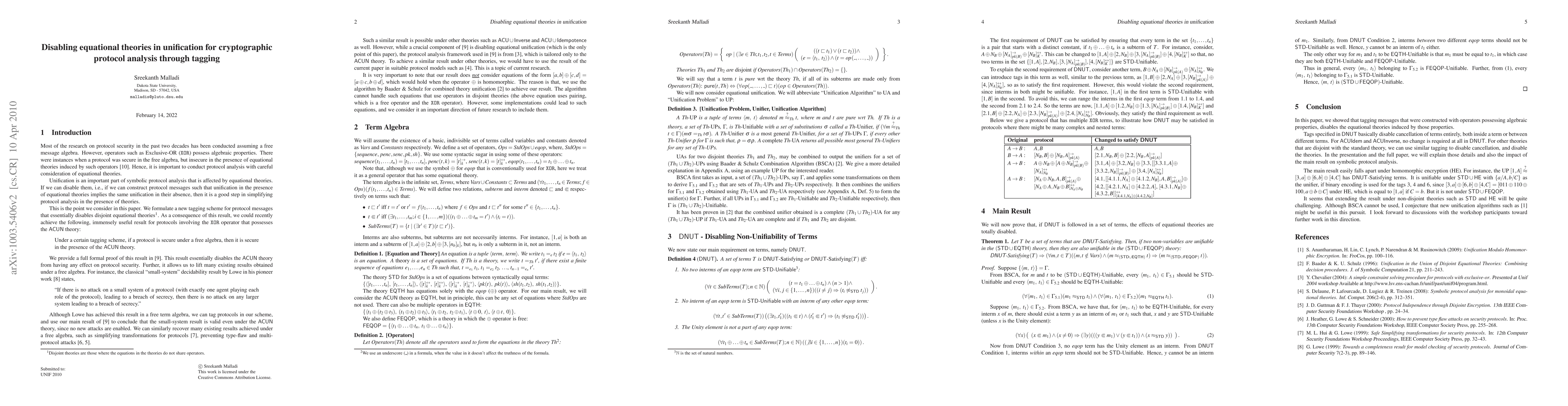 In this paper, we show a new tagging scheme for cryptographic protocol messages. Under this tagging, equational theories of operators such as exclusive-or, binary addition etc. are effectively disabled, when terms are unified. We believe that this result has a significant impact on protocol analysis and security, since unification is at the heart of symbolic protocol analysis. Hence, disabling equational theories in unification implies disabling them altogether in protocol analysis for most operators and theories.